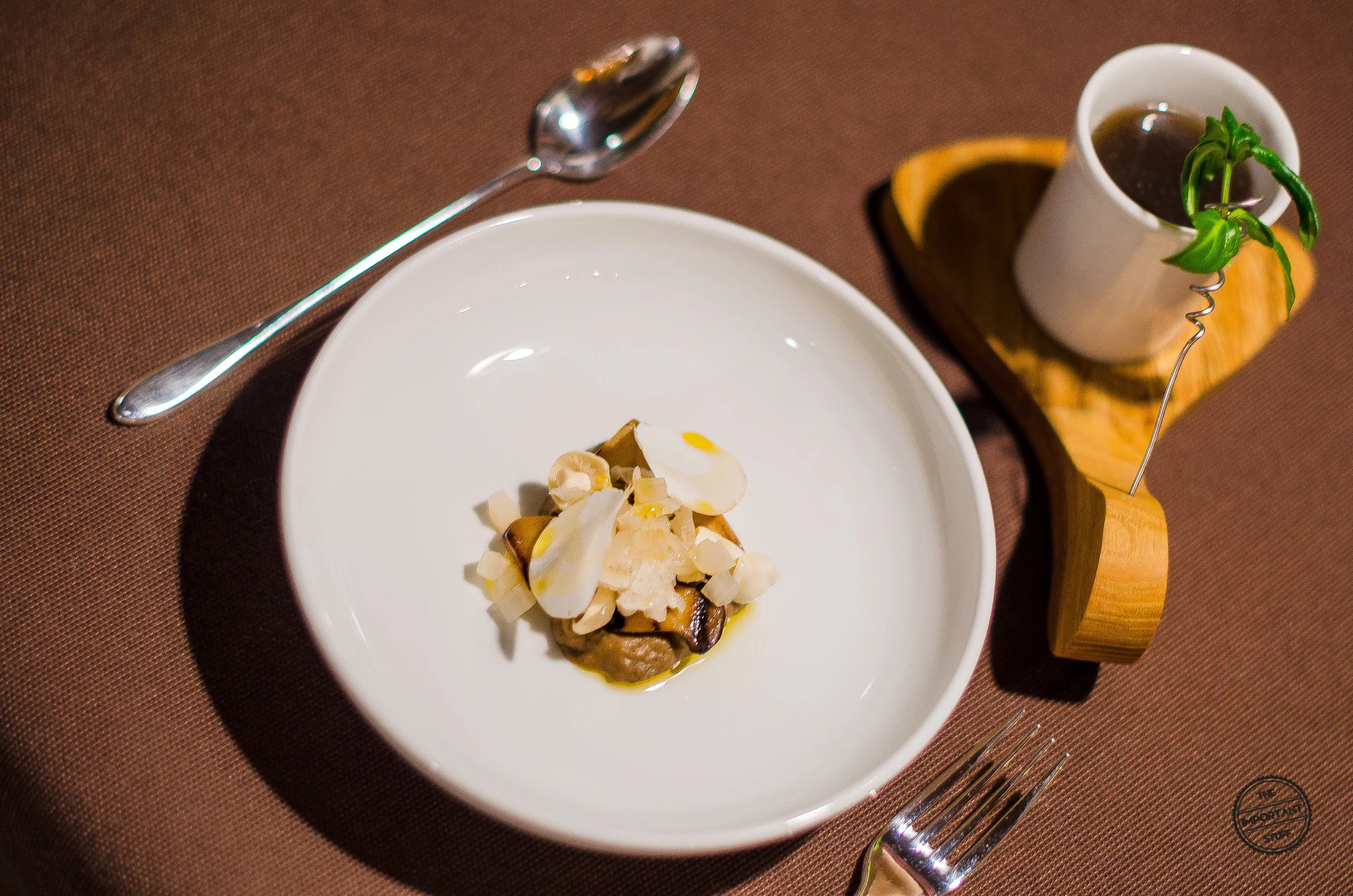 Nach Fleisch und Fisch geht's vegetarisch weiter mit einer Wildpilzbouillon. Ich sitze direkt am Fenster mit Blick auf die spärlich beleuchtete, kalte Bergnacht, da passt so eine Brühe einfach perfekt. Die im Syphon angesetzte Bouillon ist mit Rauch und Zitronen-Bergbohnenkraut aromatisiert, dampfend heiss und hocharomatisch duftend, schmeckt ebenso intensiv wie sie riecht und ist dabei wunderbar wärmend. Dazu ein kleines Blättchen des Pilzkrauts im Tassenhalter, das ist die Definition von purem Umami. Im Schälchen nebenan befinden sich diverse Präparationen von Zuchtpilzen: eine Shiitakecreme, rohe Buchenpilze, grillierte Kräutersaitlinge sowie etwas Bierrettich-Kimchi. Das kann es in Sachen Intensität nicht mit der Brühe aufnehmen und könnte generell von einem Flöckchen Salz profitieren, schmeckt aber nicht schlecht. Dazu wird ein schmackhaftes Appenzeller Schwarzbier serviert.