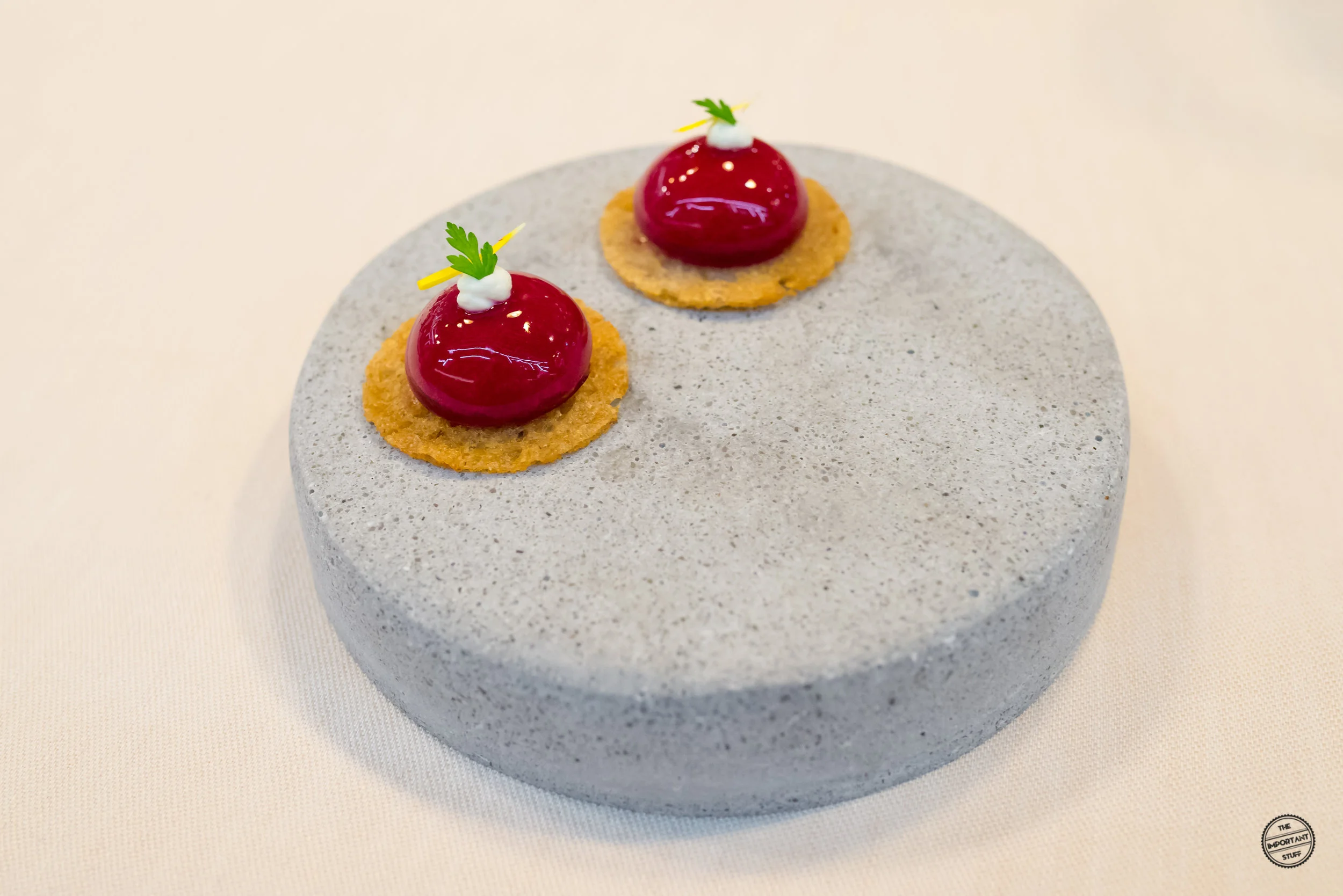 Die Rotkohl-Apfel-Sphäre liegt auf einem Graubrotchip und transportiert sehr akkurat die Aromen ihrer Füllung, die für eine leichte und vergnügliche Erfrischung sorgen.