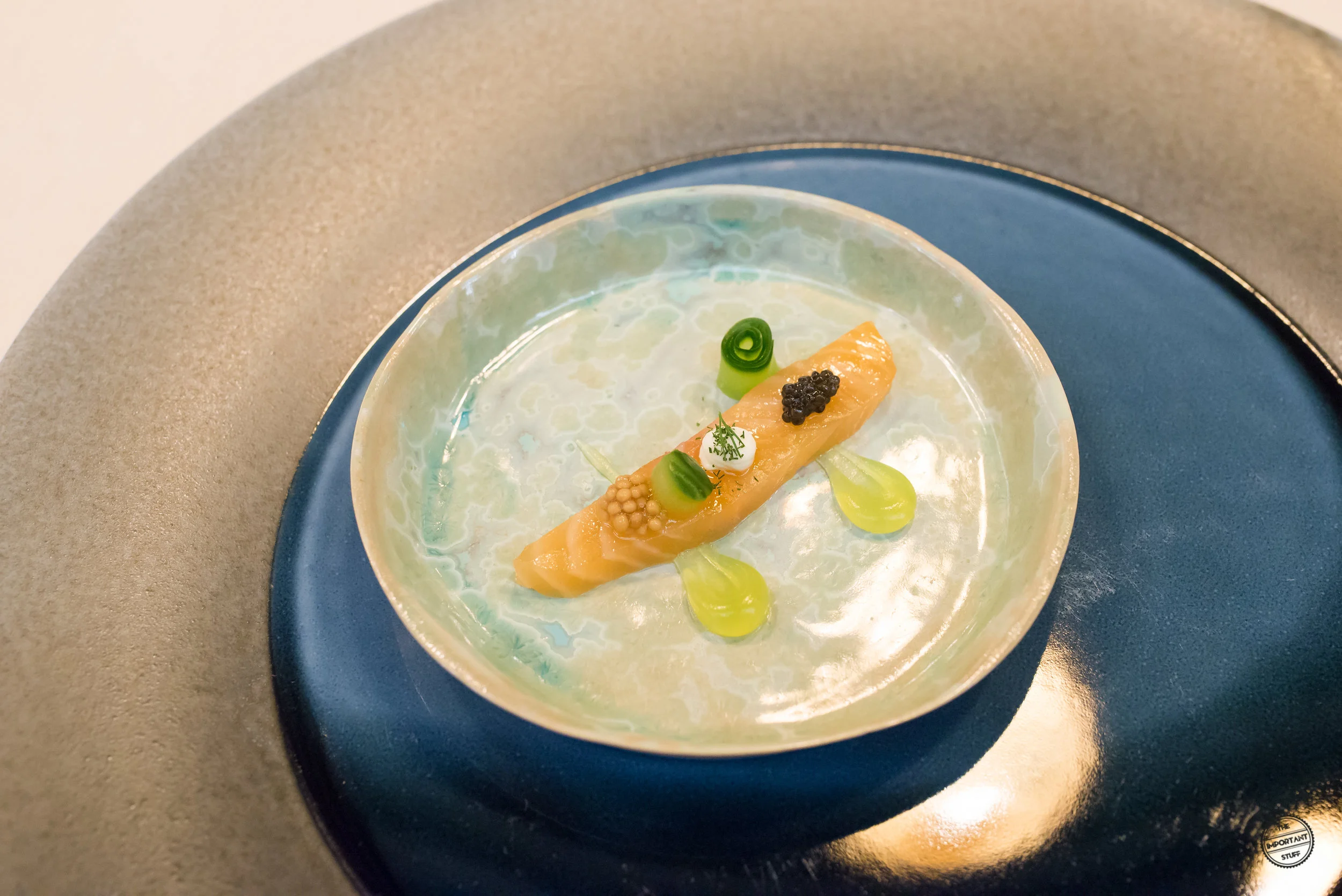 Ein nächstes Amuse Bouche dreht sich um Lostallo Alpenlachs, Apfel, Senf und Gurke. Der in Lostallo im Kanton Graubünden gezüchtete Atlantiklachs wurde mild geräuchert, ist sehr zart und nicht so fett, wie man das gemeinhin kennt. Gekonnt konterkariert wird der Fisch durch die knackig-säuerliche Einfassung.