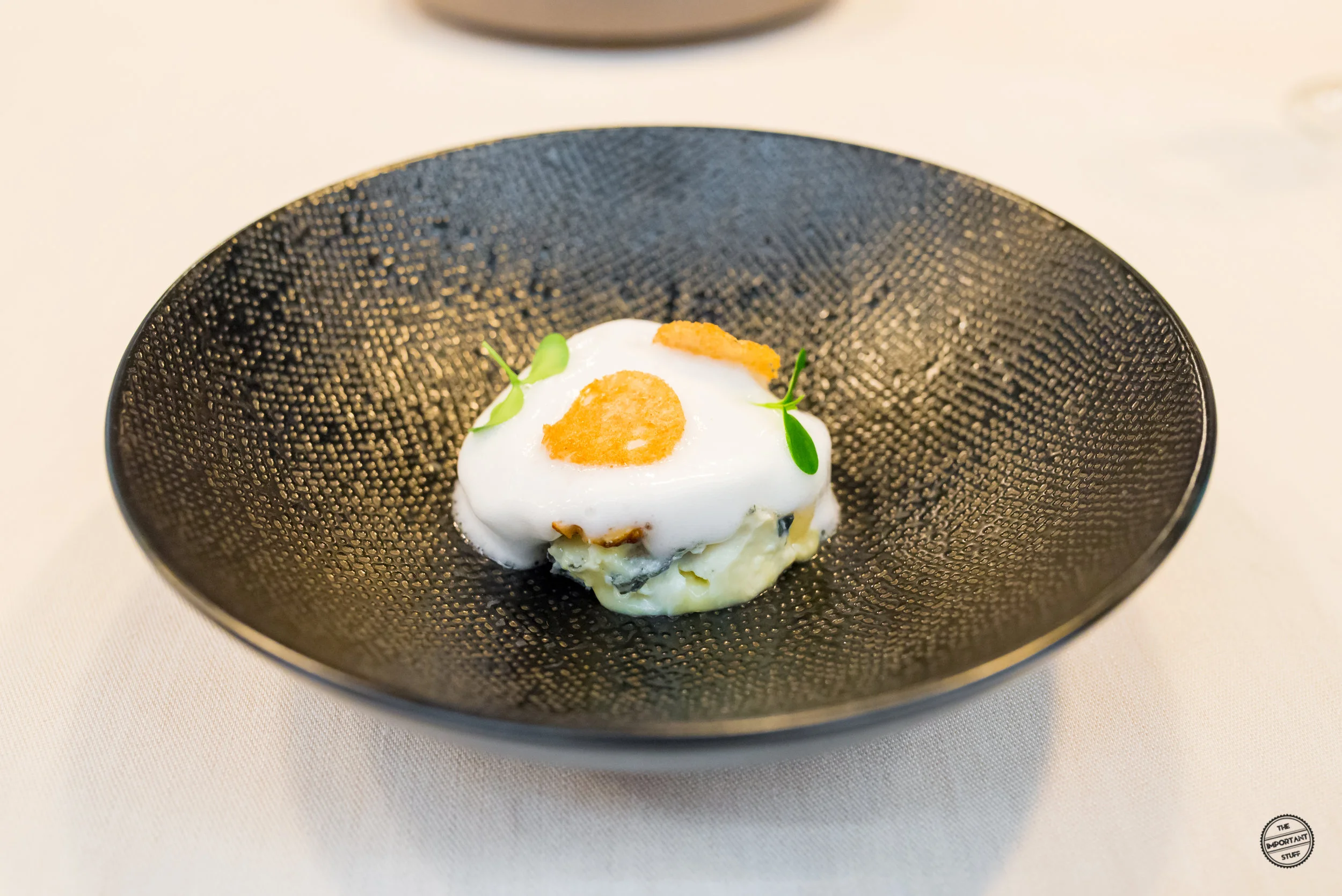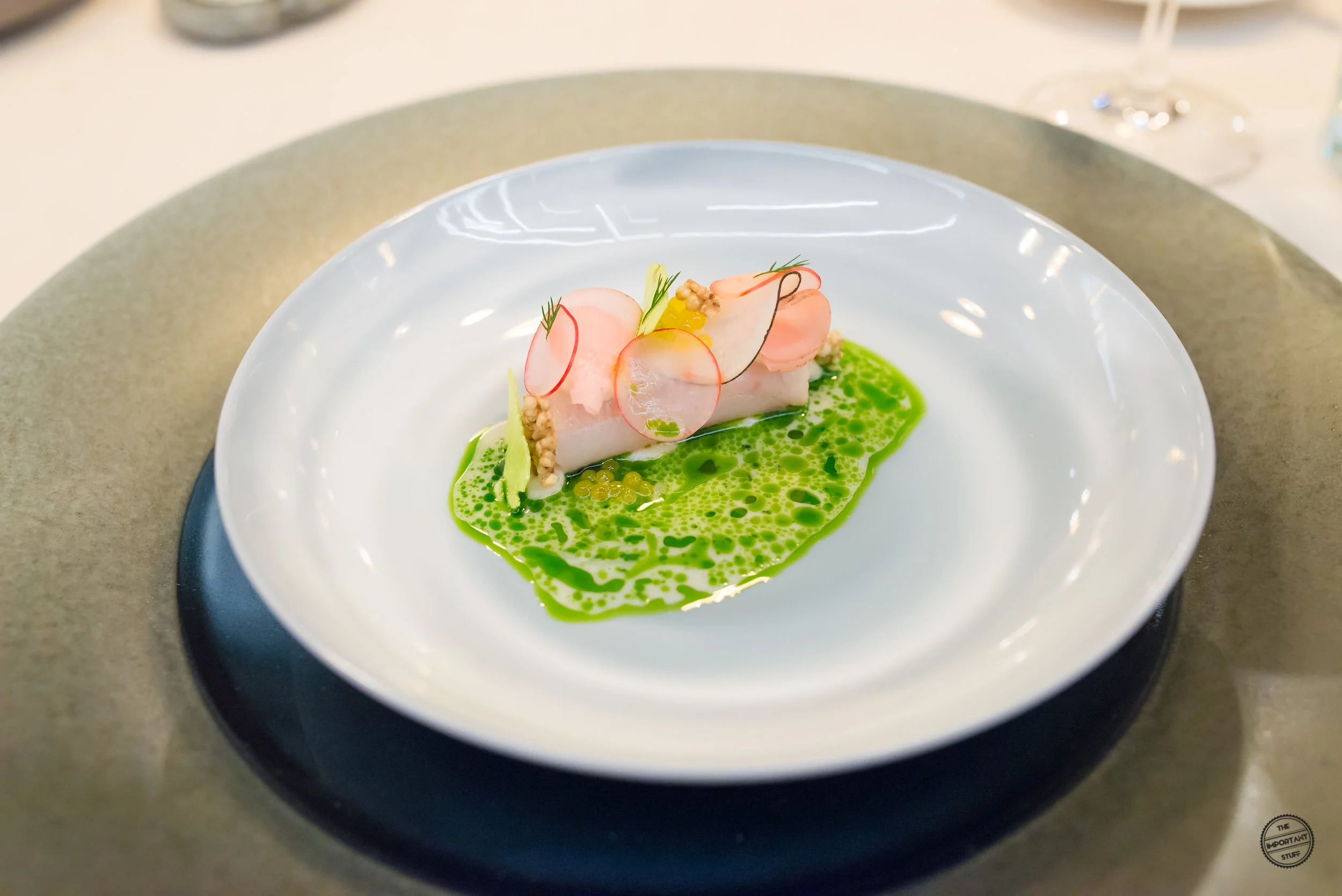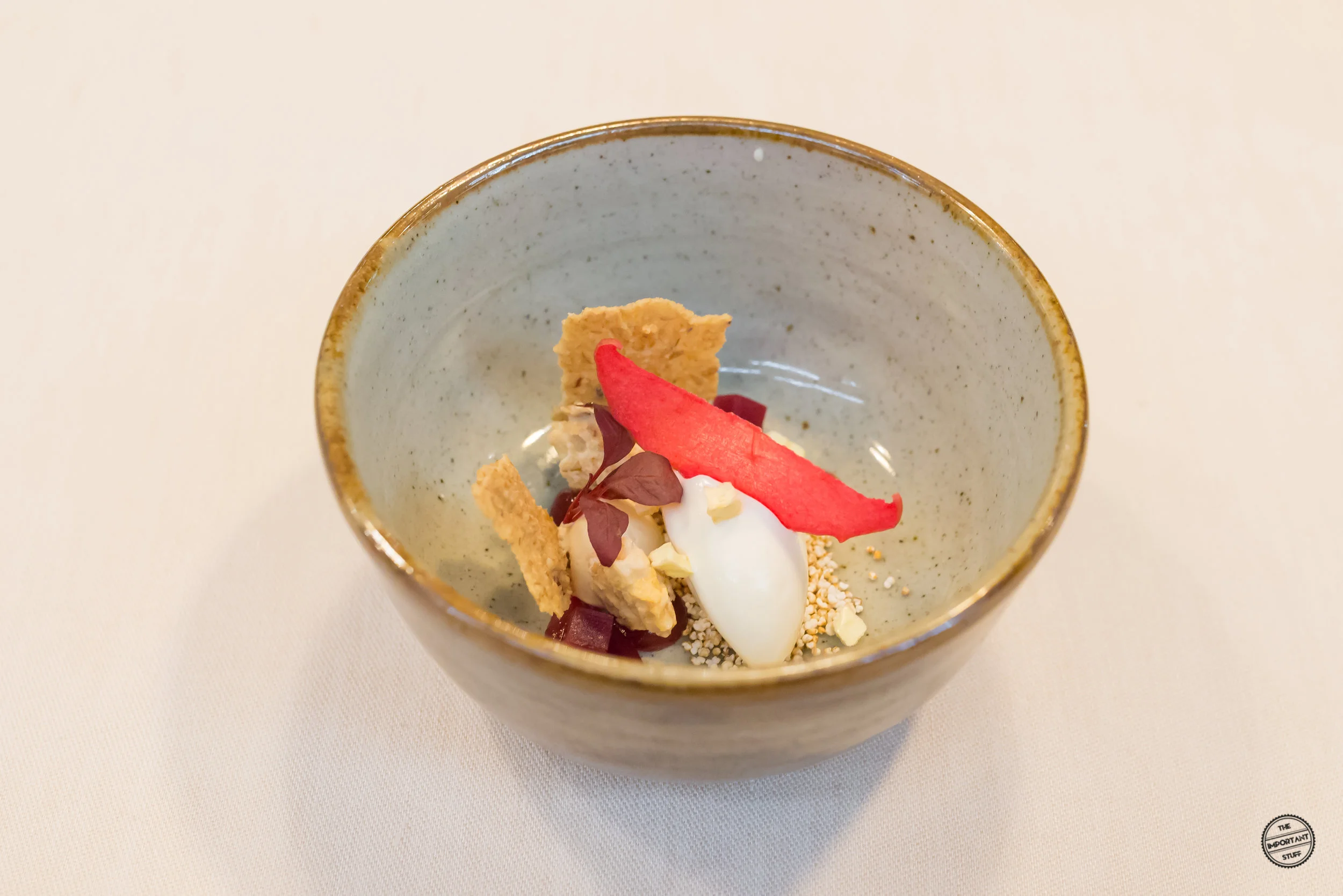 Eine Reminiszenz an die Küche von Vreni Giger sind die Zwiebeltexturen mit Molke, Tapioka und Vogelmiere. Frau Giger war bekannt dafür, dass sie bescheidene, rustikale Zutaten in einen Fine Dining Kontext gesetzt hat. Zipfel hat dieses Konzept nochmals merklich weiterentwickelt und verfeinert, wie diese Kreation zeigt. Die Zusammenstellung ist grundsätzlich stimmig, allerdings sind einige Zwiebelscheiben etwas zu roh, was sich auch in den kommenden ein, zwei Gängen noch ein wenig negativ am Gaumen bemerkbar machen wird.
