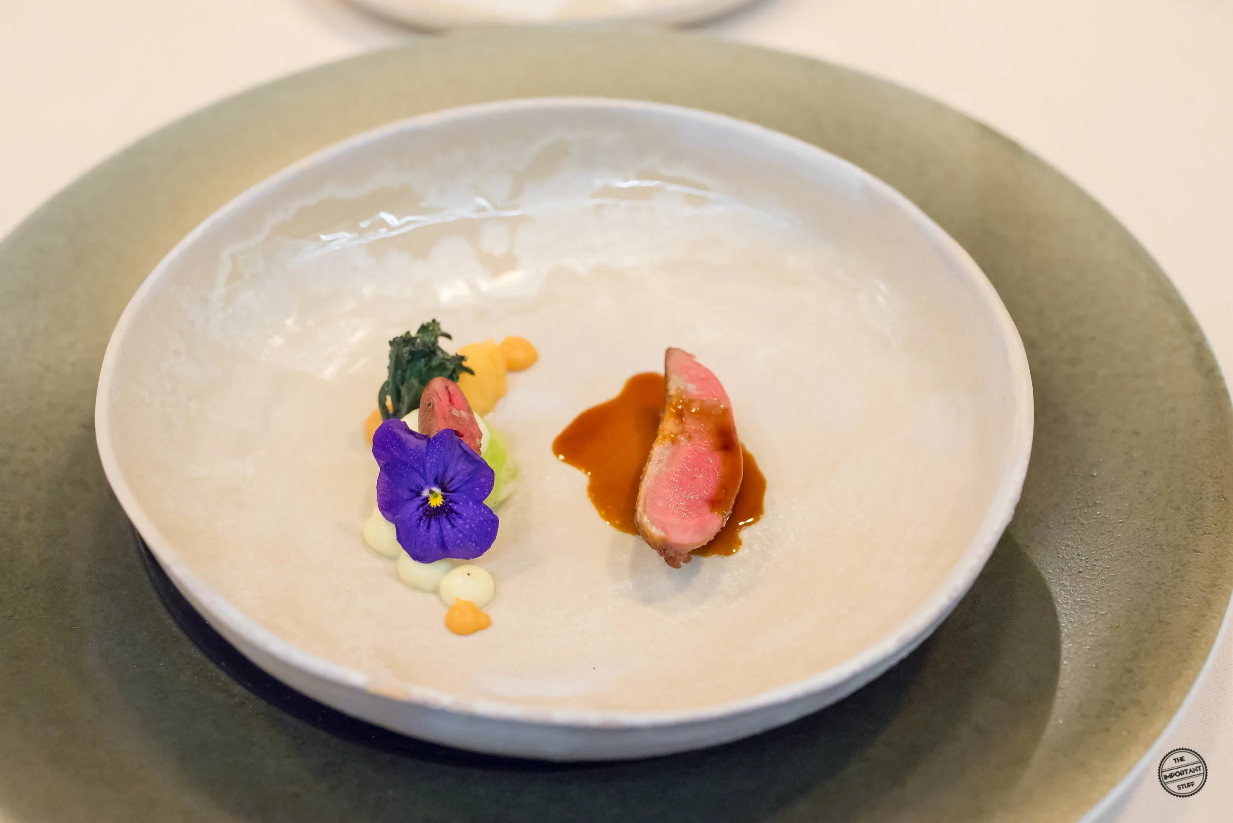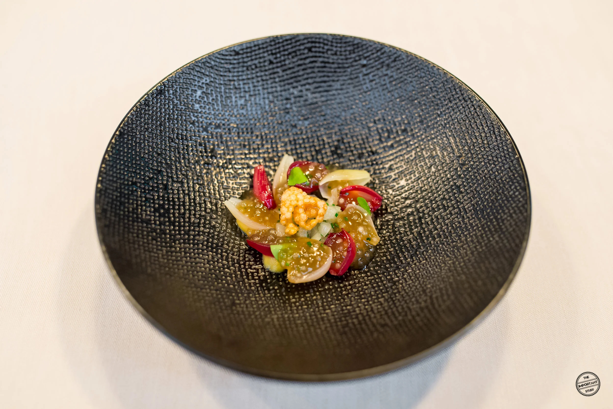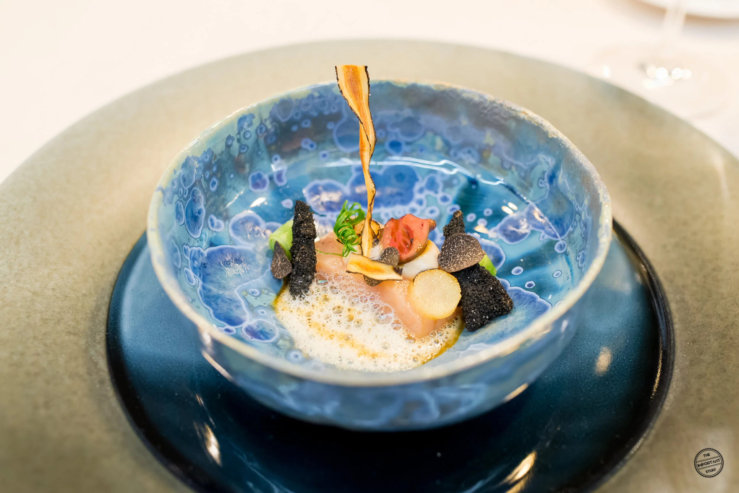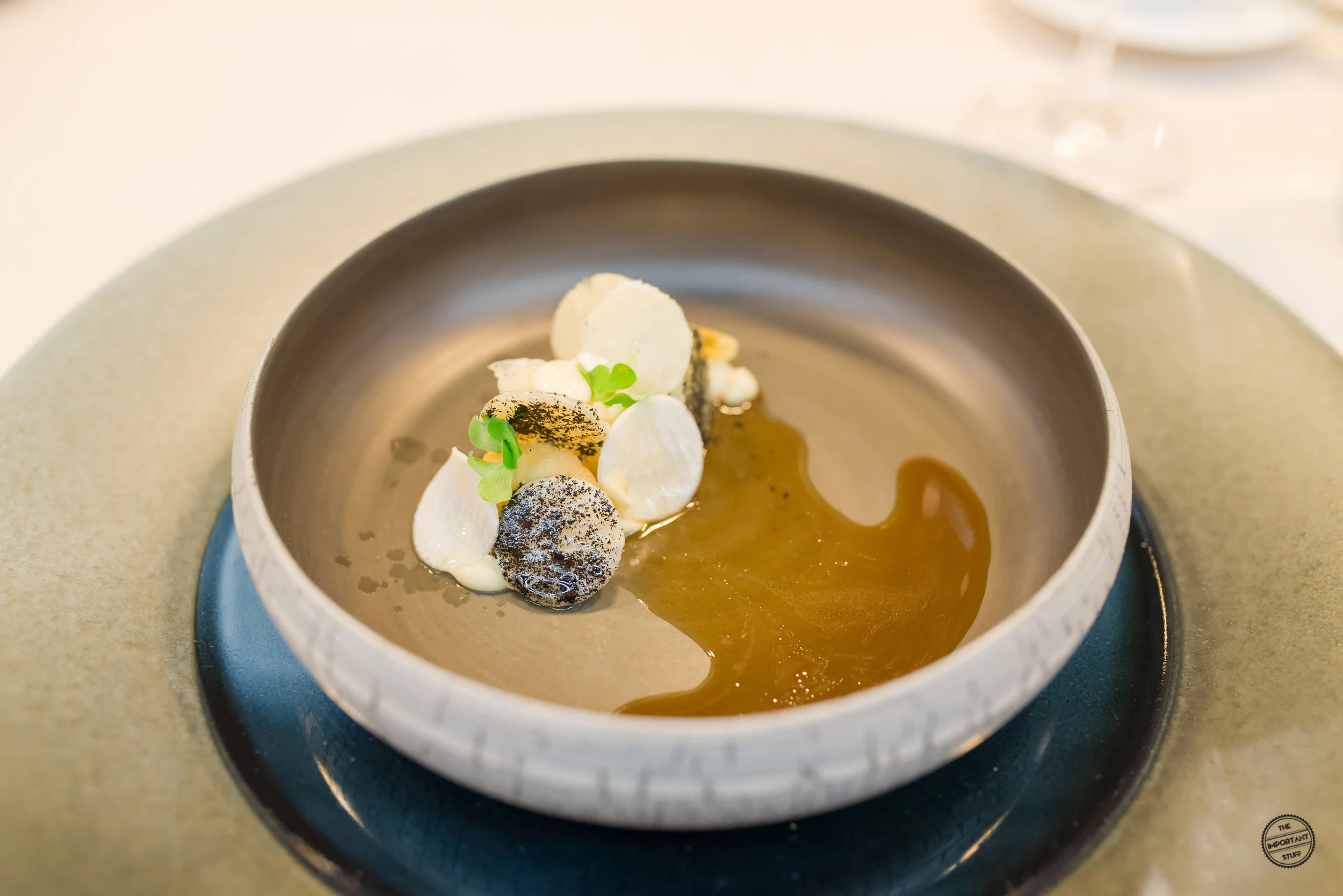 Eine Reminiszenz an die Küche von Vreni Giger sind die Zwiebeltexturen mit Molke, Tapioka und Vogelmiere. Frau Giger war bekannt dafür, dass sie bescheidene, rustikale Zutaten in einen Fine Dining Kontext gesetzt hat. Zipfel hat dieses Konzept nochmals merklich weiterentwickelt und verfeinert, wie diese Kreation zeigt. Die Zusammenstellung ist grundsätzlich stimmig, allerdings sind einige Zwiebelscheiben etwas zu roh, was sich auch in den kommenden ein, zwei Gängen noch ein wenig negativ am Gaumen bemerkbar machen wird.