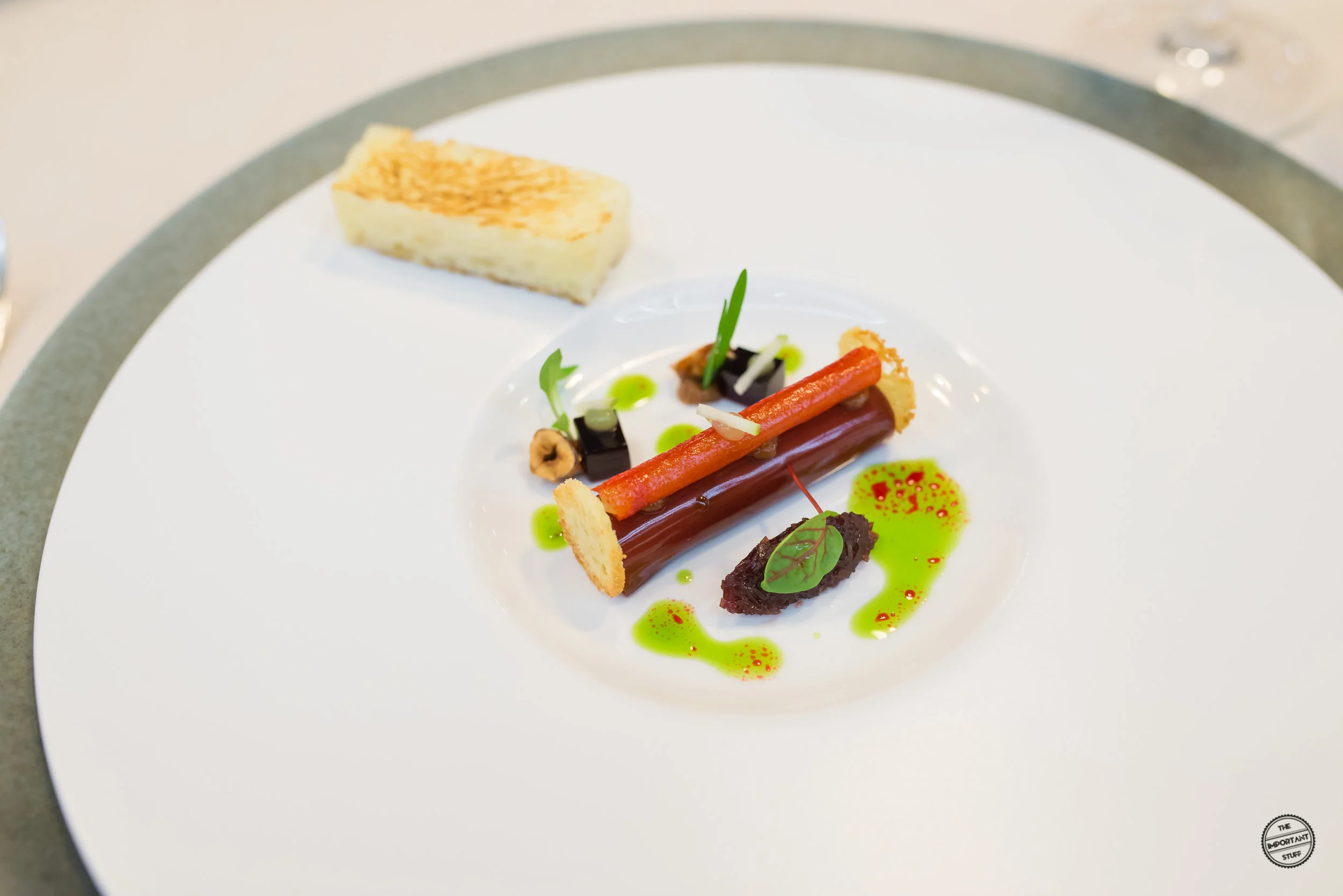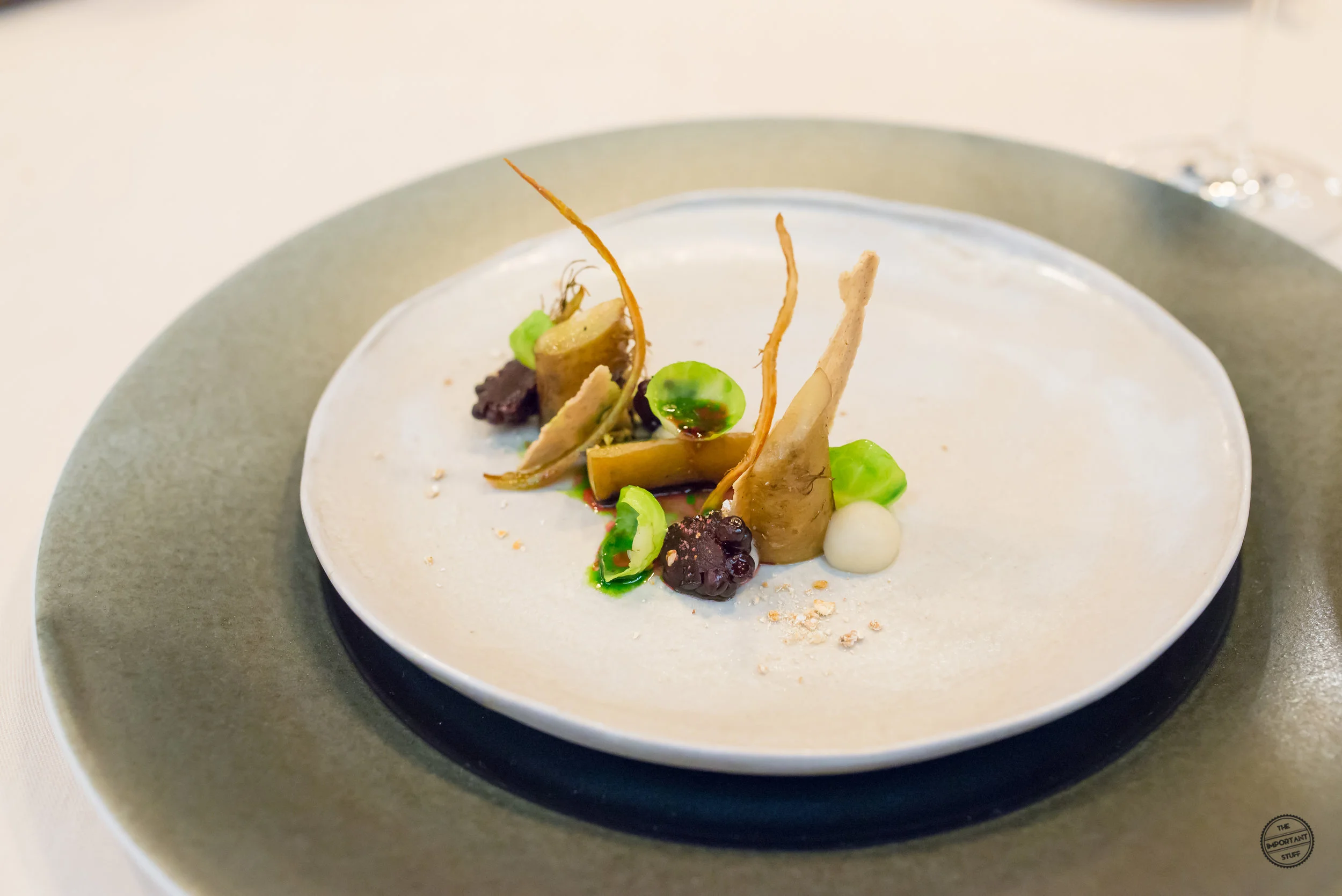 Aus dem vegetarischen Menü wird nun die Haferwurzel mit Porrigde Crème, eingelegten Brombeeren vom Sommer und Rosenkohl serviert. Überschau- und eher unscheinbar entpuppt sich dieser Einschub als absoluter Knaller. Durch das Garen in Nussbutter wird der Haferwurzel eine elegante Üppigkeit verliehen. Die natürliche Süsse und Nussigkeit wird von der karamellisierten Haferflockencrème aufgegriffen und durch einen Knusperchip sowie einen Crumble zusätzlich akzentuiert. Die Blätter vom Rosenkohl bringen eine angenehm herbe Note ins Spiel. Die Brombeeren vom letzten Sommer samt Vinaigrette des Fruchtfonds, das mit etwas Schnittlauchöl aufgepeppt wurde, sorgen für ein belebendes Säurespiel. Alle Elemente stehen im perfekten Einklang zueinander und kreieren zusammen ein absolut herausragendes Esserlebnis, welches ich vor wenigen Minuten, als der Teller vor mir auf den Tisch gestellt wurde, so sicher nicht erwartet hätte. Sollte jemand wirklich noch einen Beweis brauchen, dass herbizentrische Küche auch zu höchsten kulinarischen Weigen taugt: Bitteschön, hier ist er.