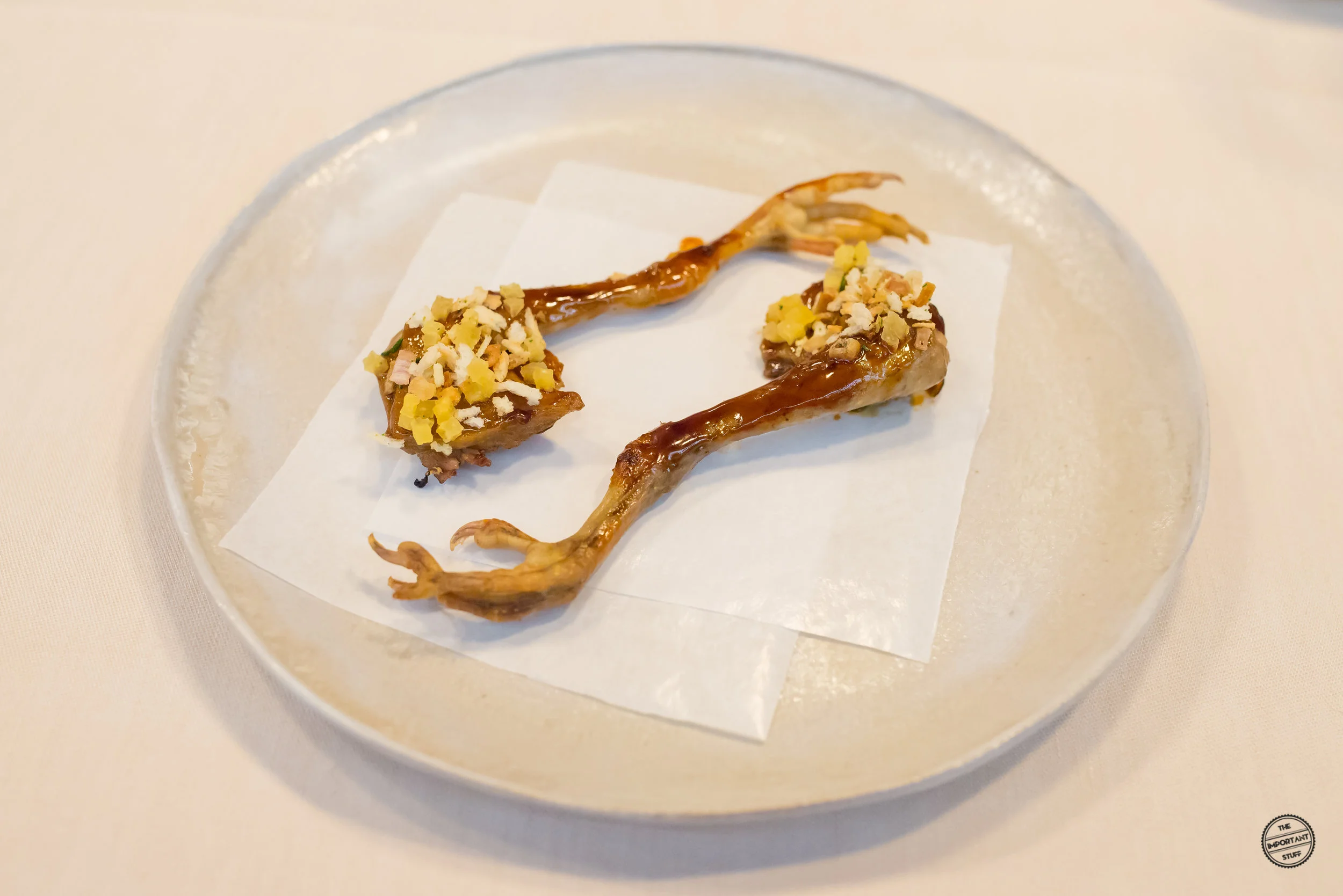 Als kleine Einstimmung auf den gleich folgenden Teller schickt die Küche eine geschmorte Taubenkeule mit Crumble von getrockneter Quitte und Röstzwiebeln. Mann, ist das gut. Saftig, klebrig, zum fingerlecken gut.