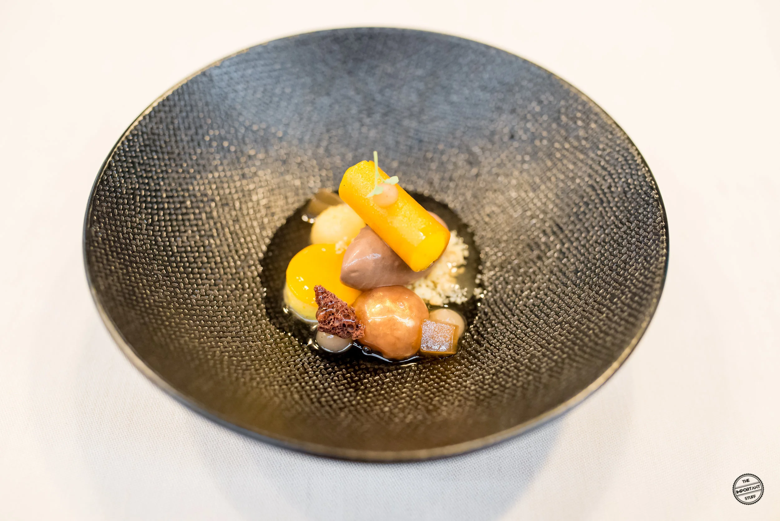 Regelmässige Leser werden es wissen: ich bin kein grosser Freund des Käsegangs. Ausser, er besteht ausschliesslich aus perfekt gereiftem Käse. Doch ich werde immer öfter positiv überrascht vom vermeintlich ungeliebten Gang. Vor allem dann, wenn ein Blauschimmelkäse verarbeitet wird. Genau das ist heute mal wieder der Fall mit Blaues Hirnli von Jumi mit Perlen und Espuma von der Birne, kandierten Haselnüssen, Tahoonkresse und einem Brotchip. Der Grund, warum die Edelschimmelpilzerzeugnisse so gut taugen um damit rumzuspielen, ist deren Komplexität und ausgeprägte Aromatik. Will heissen, ziemlich egal was man damit anstellt, der Käse steht im Mittelpunkt, der Rest dient nur der Würzung oder der Textur. Dann passt das auch für Nörgler wie mich.