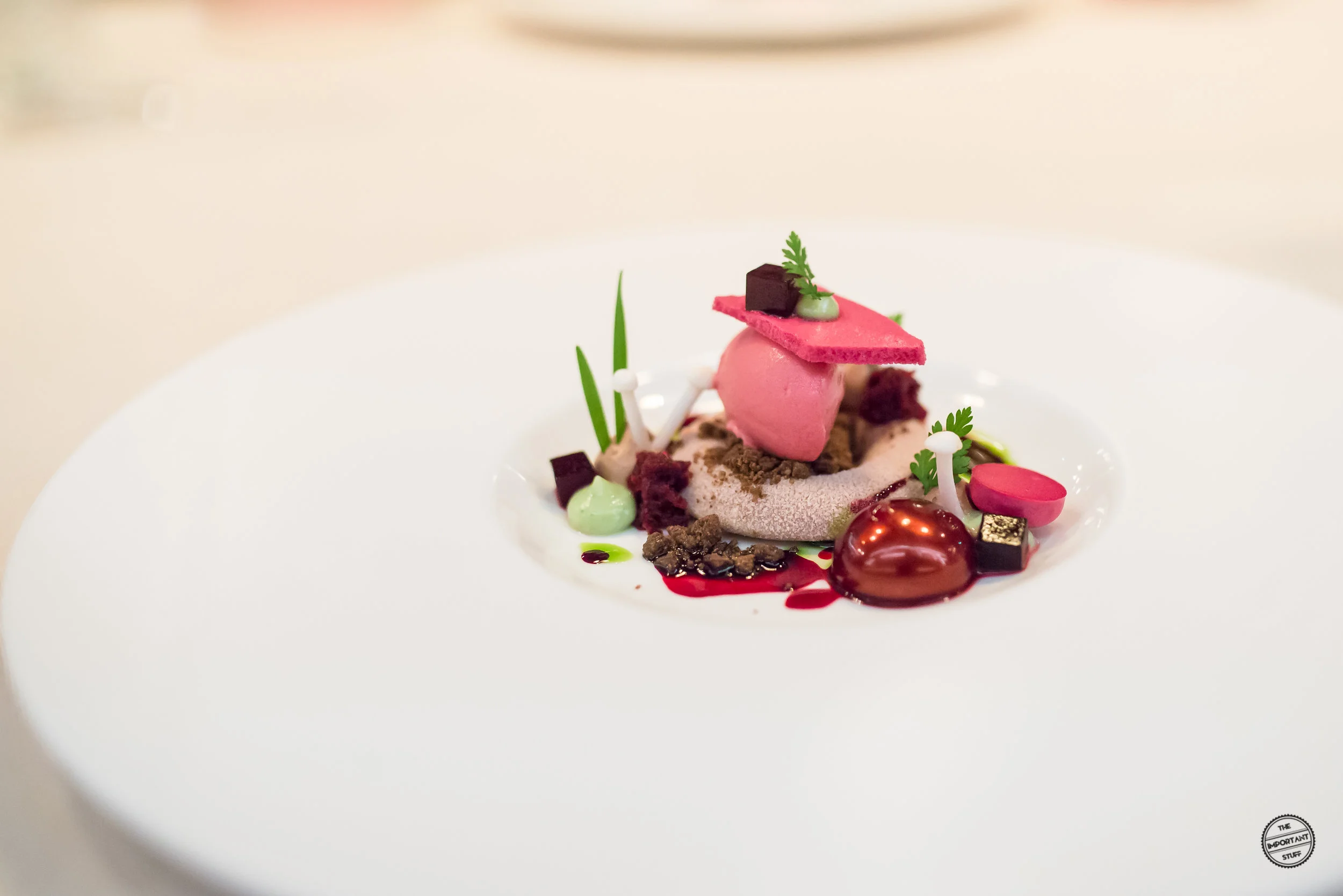 Was Züge wirklich zu leisten im Stande ist, zeigt er eindrücklich bei der Rande vom Brunner Eichhof mit Joghurt und Kerbel. Das Randen-Himbeer-Savarin kombiniert er clever mit einem Joghurt-Randen-Sorbet, Schokoladenerde sowie Kerbeljoghurt und schafft damit ein sehr komplexes, dabei erfreulich zugängliches Dessert, das keine Wünsche offen lässt. Aromatische Dynamik bei zurückhaltender Süsse, attraktives Texturspiel, tolle Optik. Kurzum, ein absoluter Volltreffer.