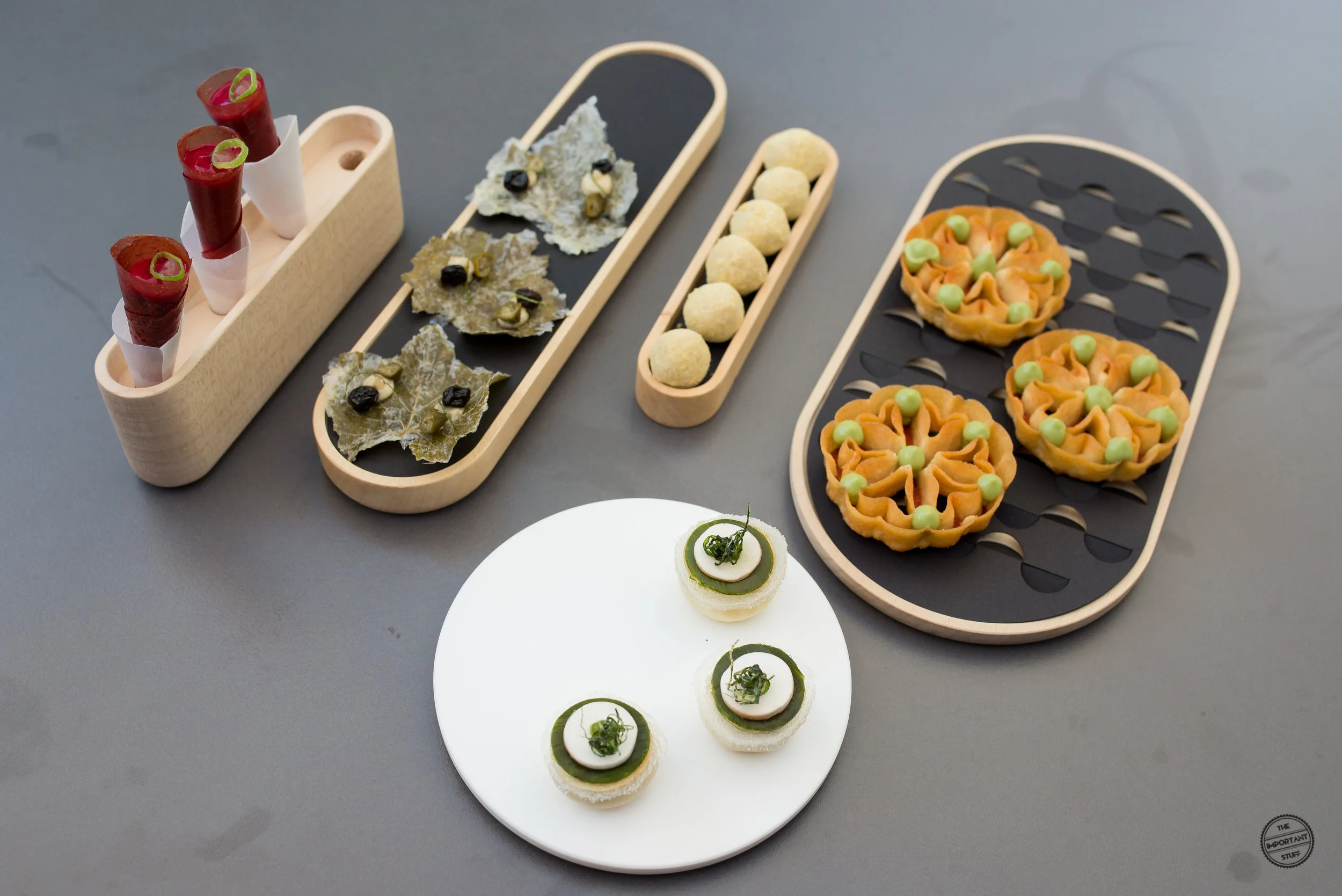 Zum frisch aufgefüllten Glas werden die ersten Snacks aufgetragen: Weinblatt, Traube - Entenleber, Haselnuss - Rote Bete Eis - Champignon, Lauch - Buchweizencrisp, Estragon, Tomate. Sehr präzise gearbeitet, abwechslungsreich und leicht inszeniert. Ein Bilderbuchauftakt, wie man ihn aus der Schlossküche gewohnt ist.