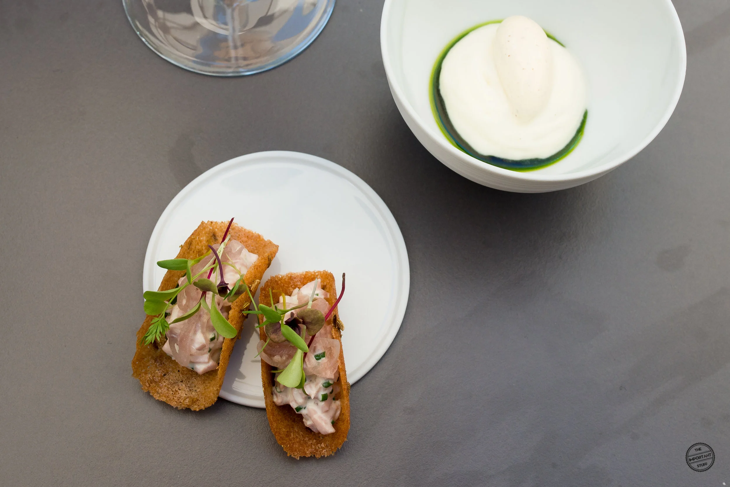 Senf Eis, Schinken, Schnittlauchöl und ein Brot Taco mit Schinken folgen. Der Schinken ist seit meinem ersten Besuch in Fürstenau ein immer wiederkehrendes Thema, das jedes Mal höchst elegant interpretiert wird und für Hochgenuss sorgt. Dieses Duo bildet da keine Ausnahme. Klasse.