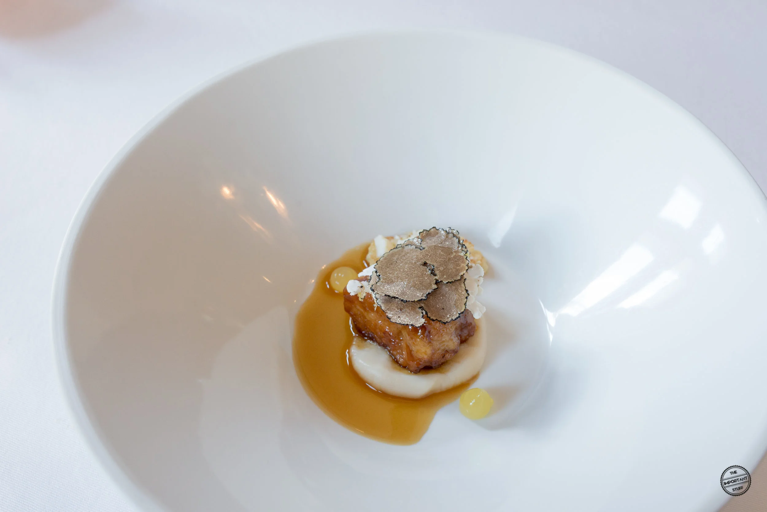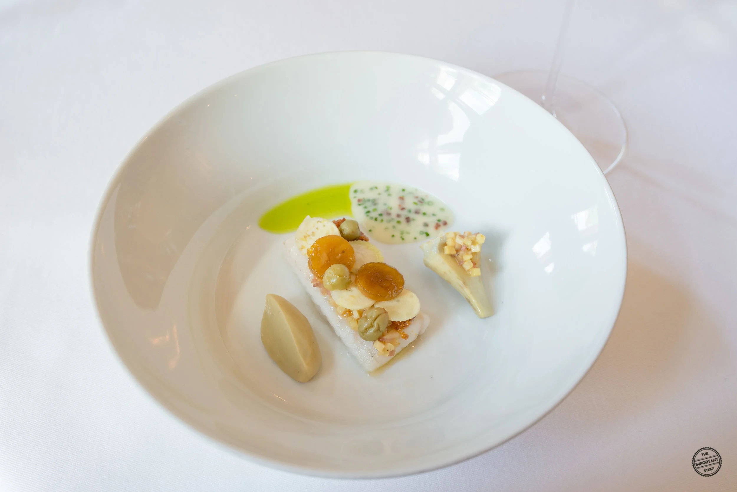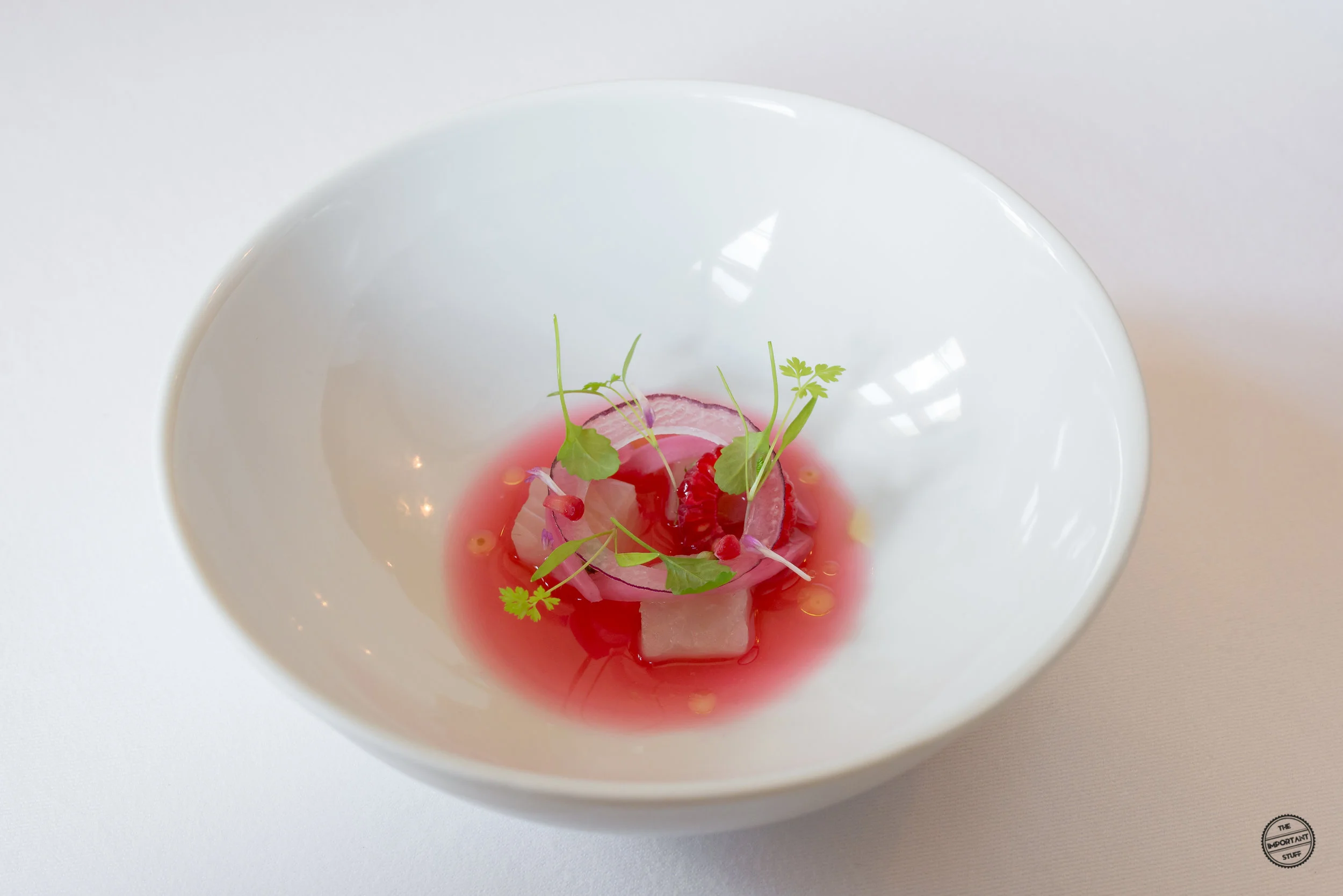 Der Lunch wird innerhalb der Schlossmauern mit Felchen, Zwiebelsud und Himbeere fortgesetzt. Ein exemplarisches Gericht für Caminadas Können. Er bändigt die scharfe Zwiebel und die Fruchstsäure der Himbeere, damit sie den delikaten Fisch nicht übertünchen. Schafft es dabei aber gleichzeitig, deren geschmackliche Integrität zu konservieren und das Ganze zu einem harmonischen Ganzen zu kombinieren. Sehr stark.