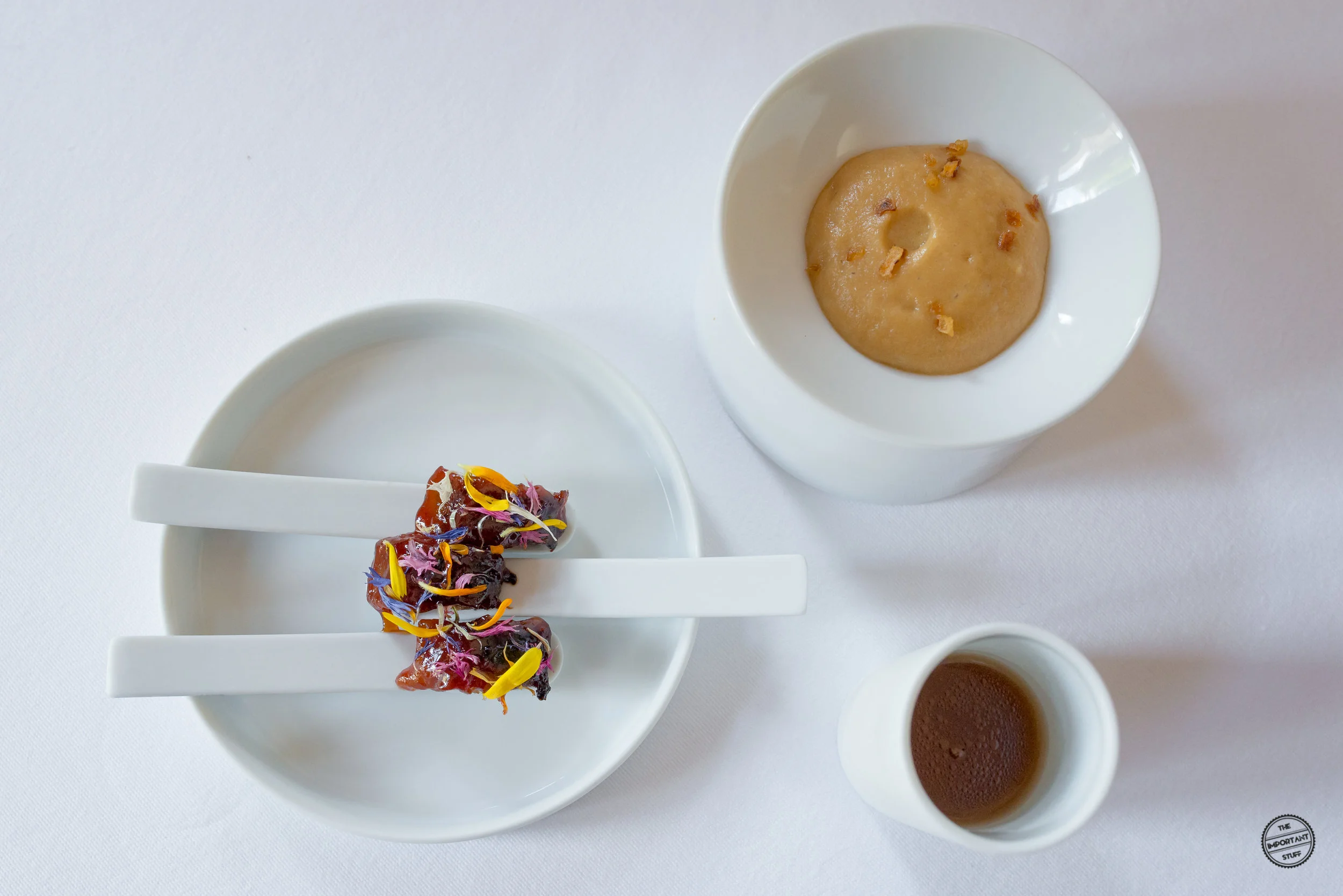 Die Langoustine mit Limone, ein Klassiker des Hauses aus dem Jahr 2008, war lange Zeit einer meiner Favoriten. Verglichen mit dem, was Caminada heute macht und wofür er grösstenteils steht, ist dieses Gericht geradezu unwirklich anachronistisch. Zwar finde ich es nach wie vor sehr ansprechend, da die Produkte von guter Qualität sind und technisch einwandfrei in Szene gesetzt werden, doch vergleicht man diese über eine Dekade alte Kreation mit den Kreationen aus den letzten Jahren, springt einem der Unterschied förmlich ins Gesicht. Denn obwohl sich die Eckpfeiler in Caminadas Küche nicht verändert haben, sind seine neueren Gerichte noch präziser gearbeitet, noch finessenreicher und vor allem noch schmackhafter.