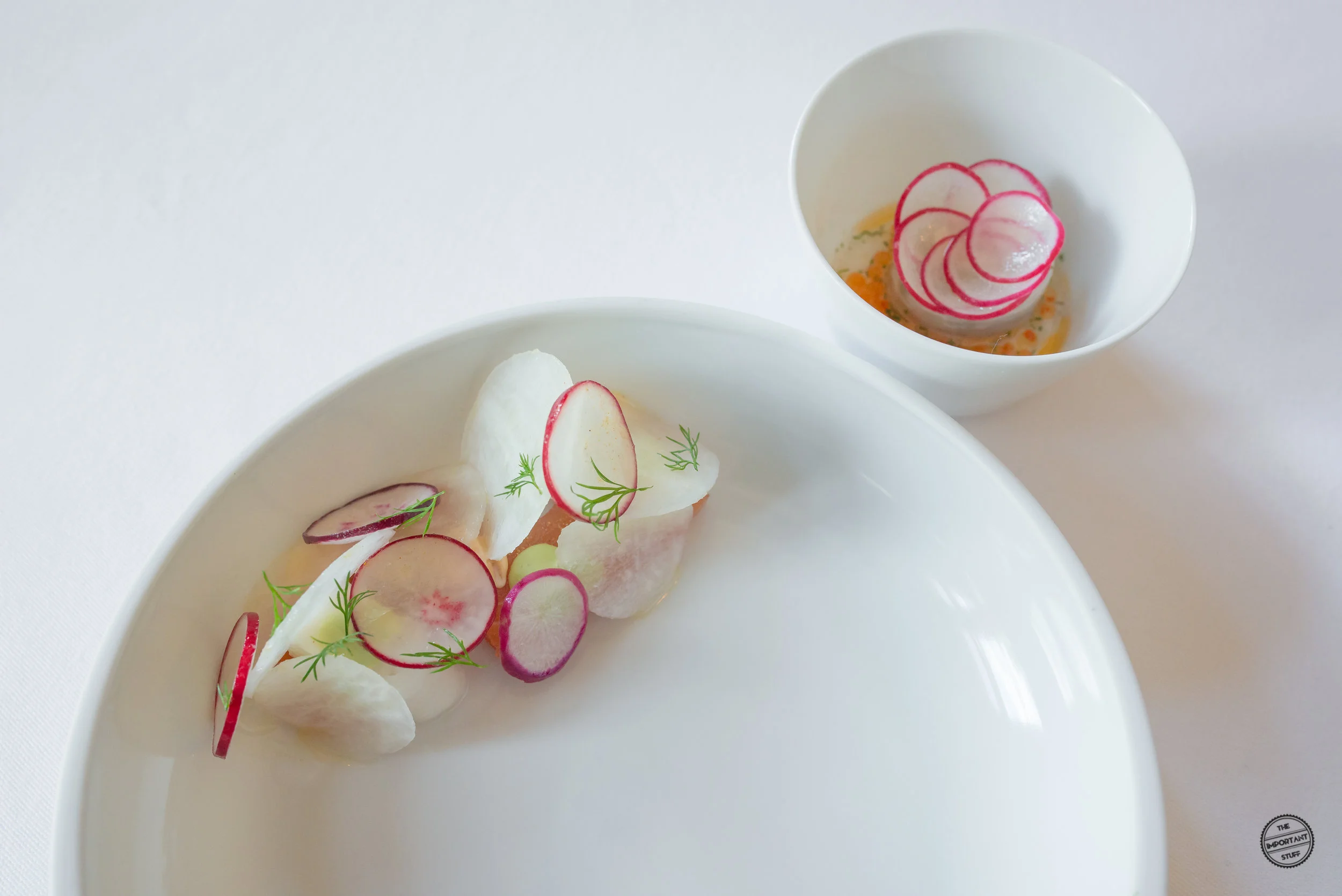Es folgt der erste Gang des Menüs Saibling, Kohlrabi und Radieschen. Der Fisch im Hauptteller ist einen Tick zu lange gebeizt, dadurch ein wenig zu fest geraten, und verliert deswegen etwas von seinem ansonten betörenden Schmelz. Die Produktqualität bleibt dennoch über alle Zweifel erhaben, ebenso wie die schlichte, knackige Einfassung, die den delikaten Saibling exzellent komplementiert. Im Schälchen befindet sich eine Art Tatar des Saiblings mit seinem Rogen und einer Vinaigrette, das dem Hauptteller in nichts nachsteht und durch eine feine Würze glänzt.