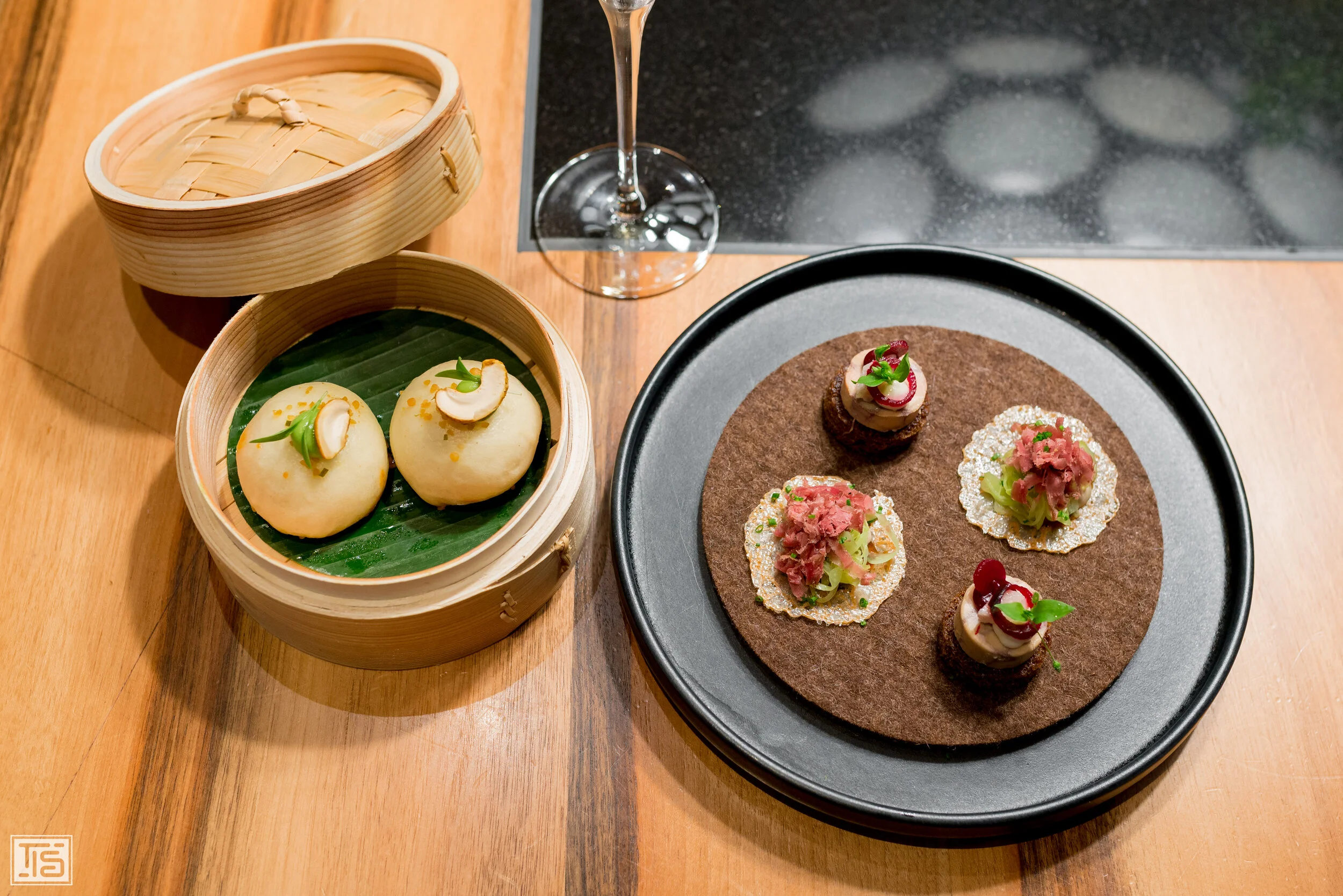 Eröffnet wird das Dinner mit einem Trio, das sich um die Bresse Ente dreht. Links im Körbchen ein Bao Bun, rechts im Teller die marinierte Leber und die knusprige Haut. Während die hauchdünne, mit etwas gehobeltem Entenschinken belegte Haut ganz im Zeichen des Crunches steht, betört die üppige Leber durch ihren luxuriösen Schmelz. Star des Trios ist allerdings der luftige Bun. Neben seiner absolut perfekten Textur und Leichtigkeit überzeugt auch der würzige, saftige Inhalt und macht das Dampfbrötchen zum ersten dicken Ausrufezeichen des noch jungen Abends.