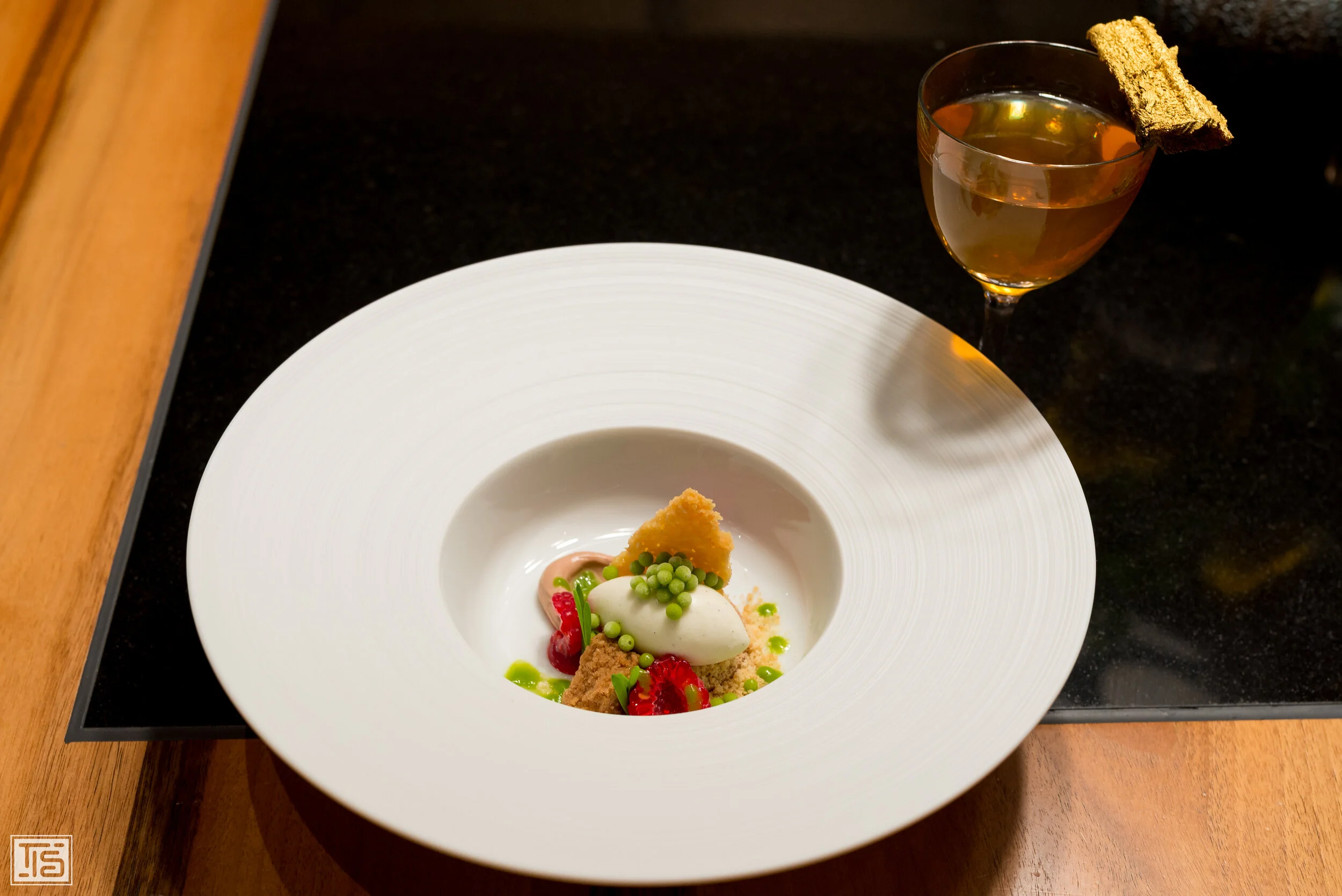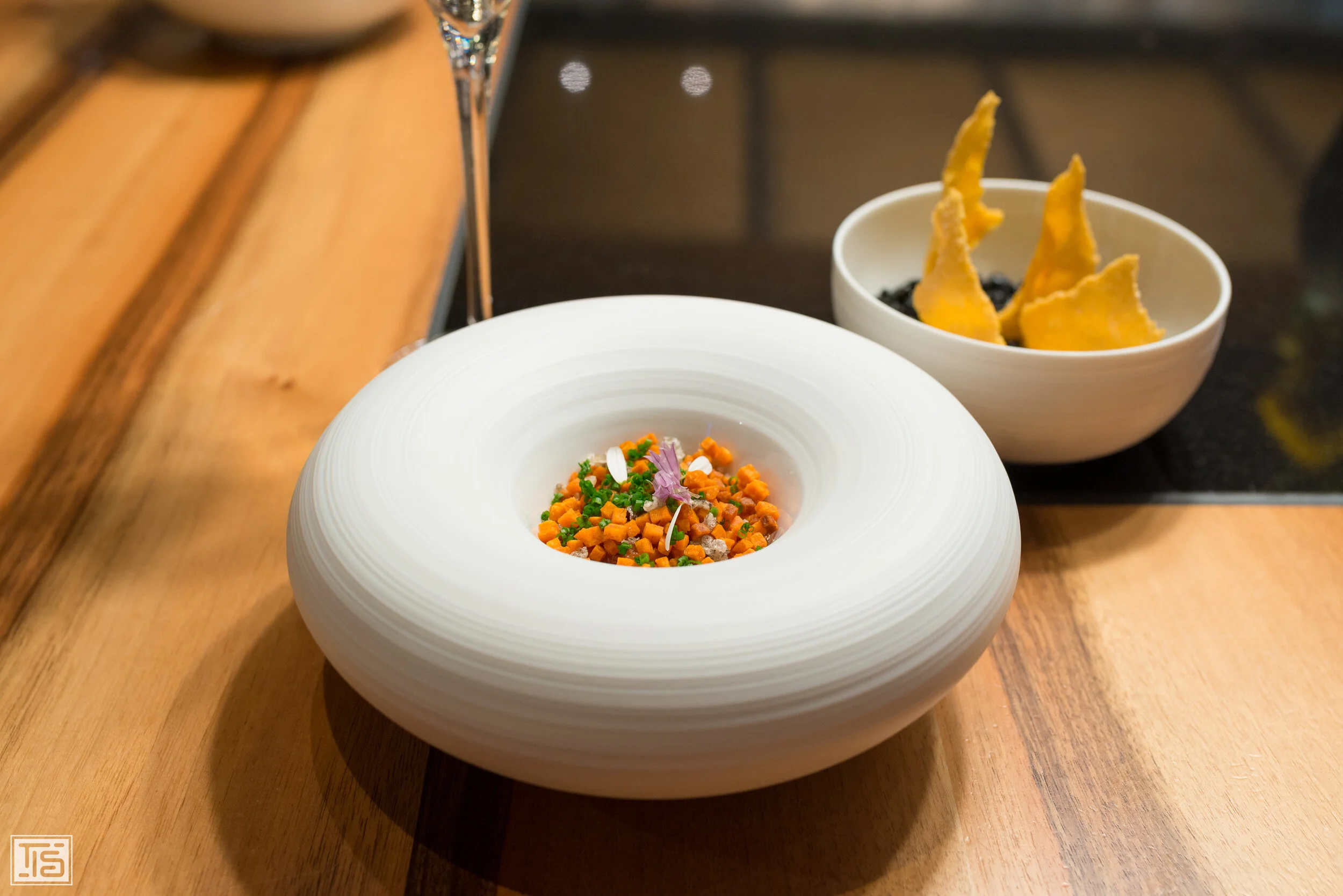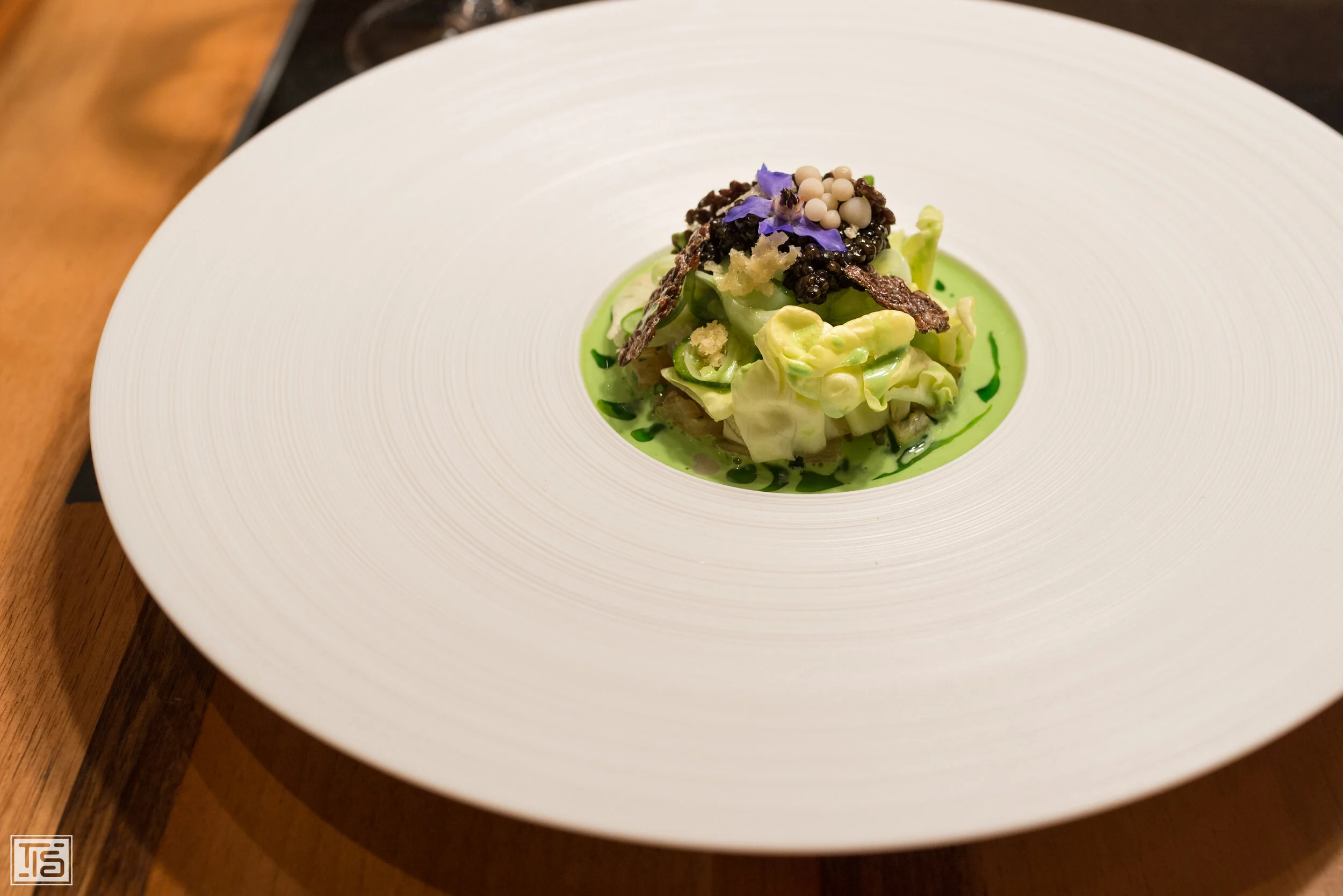 Spencer Gulf Kingfish und Meeresfrüchte mit Kaviar, Dill, Gurke, Leinsamen sind die Protagonisten des ersten offiziellen Gangs. Hinter dem Begriff Meeresfrüchte verbergen sich unter anderem die raren Gamba Blanca aus Portugal, Tintenfisch sowie Austernperlen. Heilemann ist Produktfanatiker, was man diesen unscheinbaren Schätzen aus dem Ozean bereits anmerkt. Sie unterstützen die frische Note von salzigem Meer, die dem Hiramasa in etwas subtilerer Form innewohnt, und steuern zusätzlich ein wenig maritime Süsse bei. Getoppt wird das Ensemble vom nussigen, nur dezent jodigen und ebenfalls salzigen Kaviar, der das Ensemble aus dem flüssigen Nass komplettiert. Die luxuriösen Wasserbewohner werden von einer fast schon bescheiden anmutenden, knackig-frischen Einfassung unterstützt, die die delikaten Aromen perfekt untermalt und gleichzeitig einen wichtigen Konterpunkt setzt. Hier kommt dem Leinsamenchip ebenfalls eine wichtige Rolle zu, sorgt er doch für zusätzliches Texturspiel und schlägt mit seiner Nussigkeit über den Kaviar auch die Brücke zurück zu den vielen Hauptdarstellern. Grandiose Produktqualität, harmonisch und trotzdem sehr spannend inszeniert, dazu eine kaum zu verbessernde Feinjustierung. Kurzum: wow!