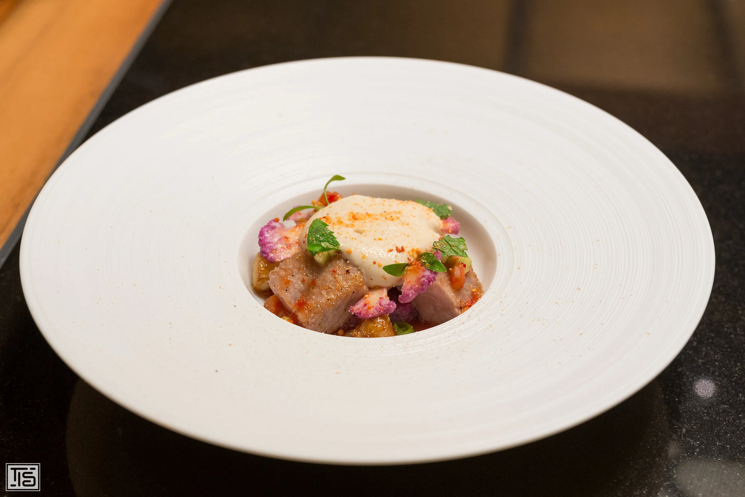 Weiter geht’s mit Balfego Thunfisch, Blumenkohl, Thai Salsa und Minze. Hier kommt Heilemanns Vorliebe für die südostasiatische Küche - und dort vor allen Dingen Thailand - erstmals so richtig zum Vorschein. Im Mittelpunkt sind zwar zweifellos die dicken Quader des grandiosen Thunfischbauchs - saftig, fettig, opulent, luxuriös - doch die Einfassung spielt in diesem Fall eine sehr wichtige Rolle. Der Bauch ist, ähnlich einem Stück Foie gras oder Wagyu, so fett, dass er unbedingt einen auflockernden und für Balance sorgenden Gegenpol benötigt. Den findet er in der mutig abgeschmeckten Salsa, die reichlich Säure mitbringt, um das Fett konterzukarieren und gleichzeitig eine umheimliche Komplexität besitzt. Das ist kein bisschen plakativ oder wirkt gesucht, sondern isst sich wie die natürlichste Kombination, die man sich nur vorstellen kann. Zusätzlich verleiht der Blumenkohl dem Ganzen eine bodenständige Substanz, während die Minze auf der anderen Seite für lebendige Frische sorgt und das Pendel noch etwas stärker in Richtung Siam fallen lässt. Unfassbar gut.