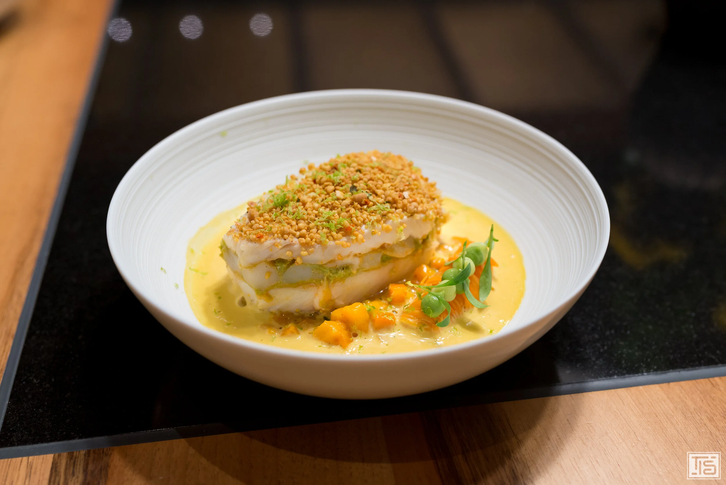 Dass die Grossartigkeit nicht abreissen wird, ist spätestens dann klar, als der Chef neben mir am Küchentisch auftaucht, um einen im Ganzen zubereiteten Steinbutt zu präsentieren. Der Butt ist mit Jakobsmuscheln gefüllt, dazu gibt es Gelbes Thai Curry und Karotten. Heilemann versteht es wie nur sehr wenige andere Köche, exotische Aromen in seine Gerichte einfliessen zu lassen, ohne dass es wie eine bemüht wirkende Konstruktion daherkommt. Alles scheint ganz selbstverständlich zusammenzuspielen, erweckt nicht den Anschein, aufgesetzt oder gar forciert zu sein. Das liegt vor allem daran, dass er keine Kompromisse eingeht. Wenn eine Kreation nach Thailand schmecken soll, dann ist die Sauce eben nicht einfach leicht mit Zitronengras parfümiert und die Currynote schwingt nicht irgendwo entfernt im Hintergrund mit. Das Curry schmeckt, wie ein (ganz hervorragendes, hausgemachtes) Curry zu schmecken hat. Es ist Hauptbestandteil des Gerichts, gibt dem Teller Charakter und es gibt natürlich reichlich davon, nicht nur vier versprenkelte Tupfer. So geht das komplexe, cremige, exotische Curry eine wunderbare Verbindung mit dem saftigen Fisch ein, der durch die Süsse der Jakobsmuscheln zusätzlich an Struktur gewinnt (auch wenn mir eine ebenfalls schon gegessen Version mit Kaisergranat noch besser schmeckt). Damit das Ganze nicht zu üppig ist, wird aus der Karotte kurzerhand eine Art Fake-Som-Tam gemacht, der Säure und Knackigkeit und somit Balance bringt. Wie bereits bei der Präsentation des Steinbutts vermutet, einfach absolut grossartig.