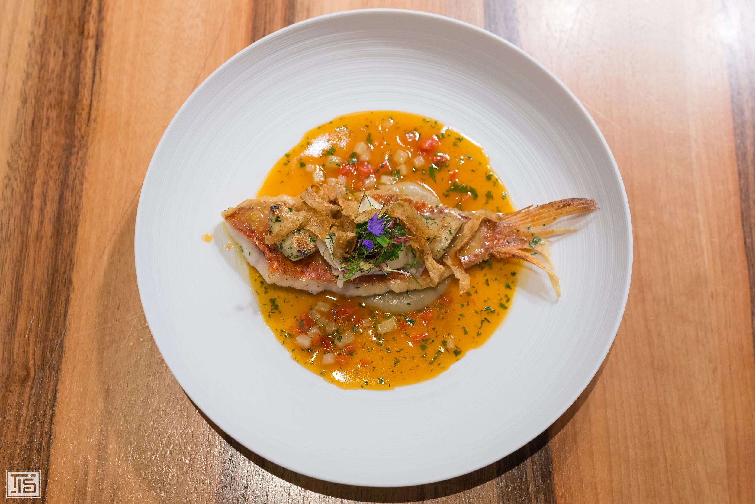 Ein Höhepunkt jagt den nächsten, denn die Atlantik Rotbarbe mit Artischocke, Bottarga und Sherry Escabeche setzt den Reigen von unglaublich grossartigen Gerichten nahtlos fort. Darauf deutet die initiale Probiergabel aber noch nicht wirklich hin. Natürlich, wie könnte es in der Küche von Stefan Heilemann auch anders sein, ist die Rotbarbe von herausragender Qualität und absolut tadellos zubereitet. Nicht nur der Fisch lässt mich unweigerlich ans Mittelmeer denken, sondern auch die Begleitung. Im ersten Moment wirkt sie fast ein Stück zu harsch, zu rustikal, zu würzig. Dieser Eindruck verflüchtigt sich aber sehr schnell und löst sich in purer Wonne auf. Denn trotz aller Kraft greift jedes einzelne Rädchen mit absoluter Präzision ins nächste. Rustikal ist das nur an der Oberfläche, darunter zeigt sich eine enorm raffinierte Kreation. Die Würzung ist heftig, ja, ebbt aber nach dem ersten Aufbranden ab und fügt sich harmonisch ins Gesamtbild ein. Locker eines der besten Gerichte rund um die bescheidene Rotbarbe, die ich jemals gegessen habe. Und eines der besten, die jemals die Küche Heilemanns verliess. Besser geht es kaum.