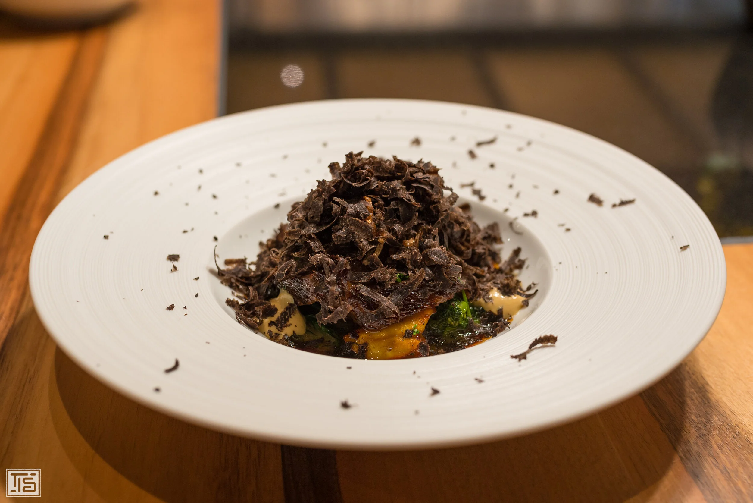 Zum Hauptgang fährt die Küche nochmal richtig grosses Geschütz auf. Australisches Wagyu Shortrib, sanft gegart, dazu wilder Brokkoli, Yuzu und eine grosszügige Portion herrlich intensiv duftender Australischer Wintertrüffeln. Die Vermutung liegt nahe, dass hier ein bisschen Luxus um des Luxus Willen zelebriert wird. Doch diese Annahme könnte nicht verkehrter sein. Denn das Fleisch ist ganz einfach von sensationeller Qualität, nicht zu fettig, so dass man problemlos auch ein grösseres Stück geniessen kann. Die Ladung dunkler Tuber-Späne komplementiert das Rind vortrefflich, überlagert es aber trotz des beeindruckenden schwarzen Berges nicht. Gegensteuer bekommt das Duo durch die bitter-säuerliche Yuzu, die so akkurat dosiert ist, dass sie gleichzeitig für Ausgewogenheit sorgt und ihre Mitspieler akzentuiert. Selbst der gegrillte Brokkoli wurde nicht einfach der Gesundheit wegen auf den Teller gelegt, sondern trägt mit seinen bitter-grünen Grillaromen und seinem Crunch essenziell zum Gelingen dieses Gangs bei. Unglaublich lecker.