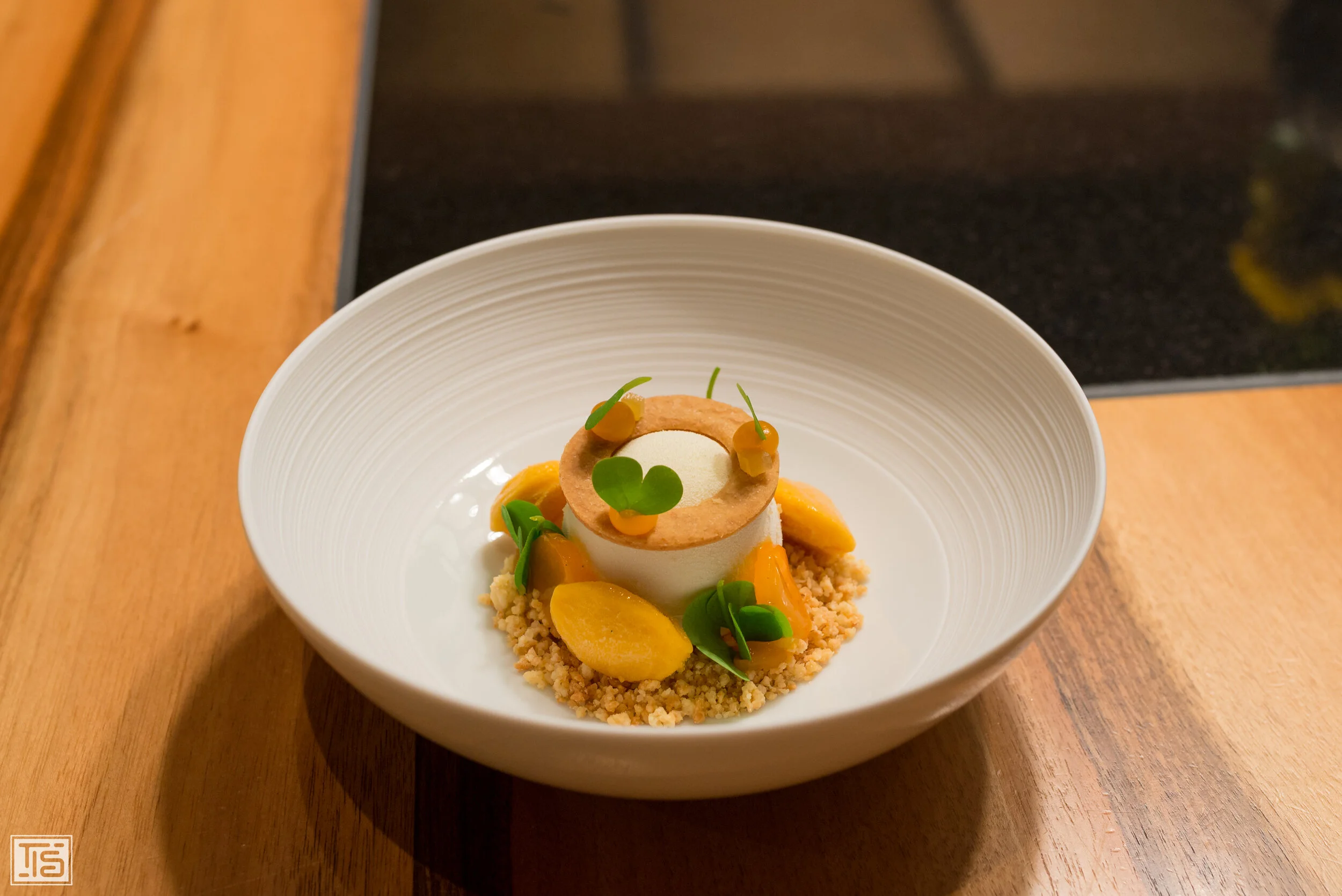 Schreitet die Stunde etwas später voran, übergibt Heilemann das Küchenzepter an seinen langjährigen Pâtissier André Siedl. Ähnlich seinem Chef, fackelt auch er nicht lange und haut mit marinierte Aprikose, Kokosnuss, Ingwer und Pandan direkt einen richtigen Kracher raus. Im Herzen (sprich geschmacklich) ist das ein zutiefst klassisches Dessert, das sich allerdings in einem leichten, modernen Gewand präsentiert. Exotisch schmeckt es, eine subtil unterliegende Schärfe vom Ingwer schimmert immer wieder durch, nussig, cremig, komplex und dabei leicht zugänglich. Das liegt vor allem an der Aprikose, die so wunderbar aromatisch ihre vollreife Fruchtigkeit über jeden Bissen legt, dass man gar nicht anders kann, als sich von Siedls erstem Streich komplett in seinen Bann ziehen zu lassen. Könnte ich direkt nochmal essen. Und dann nochmal. Und vielleicht noch ein viertes Mal.