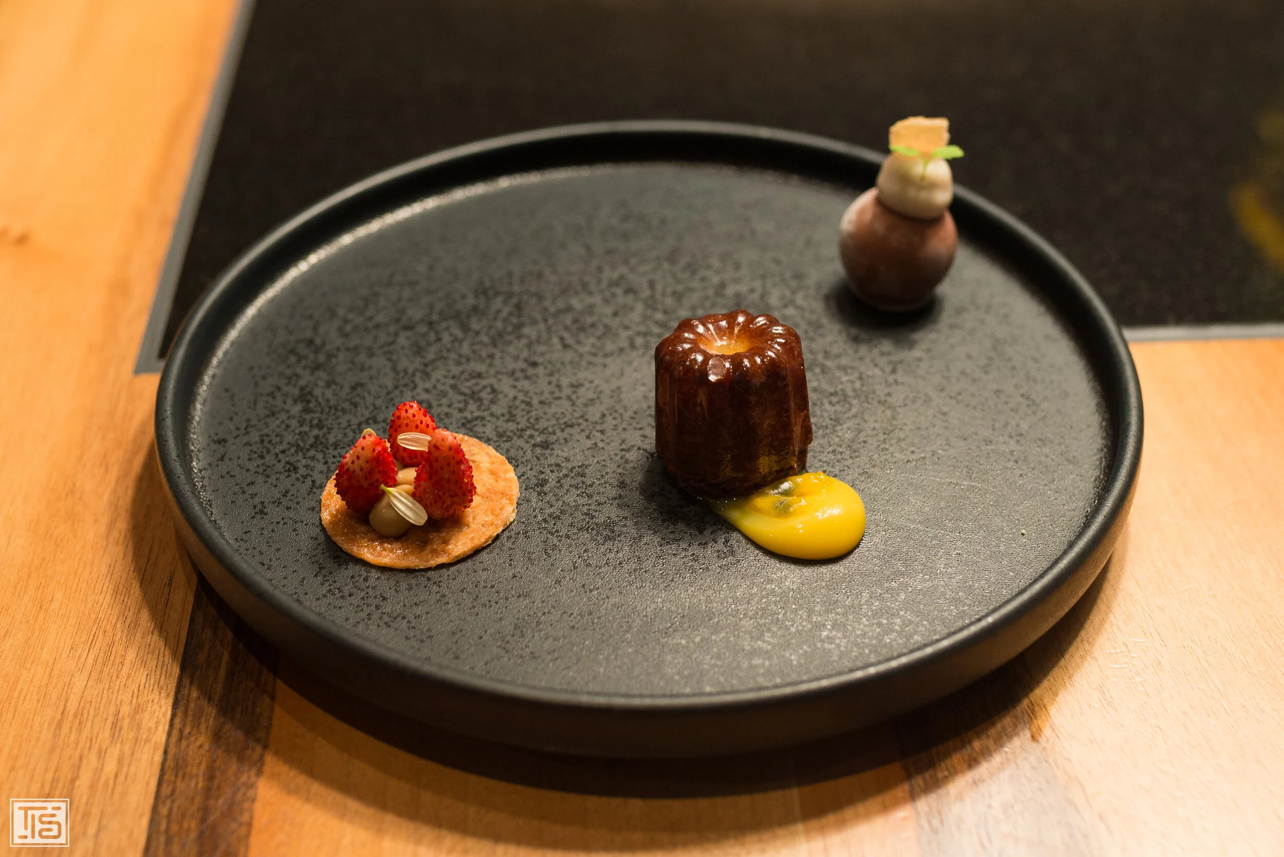 Bevor es nach Hause geht, verabschiedet sich die Pâtisserie noch mit drei Petits Fours: Canelé, Passionsfrucht, Tonkabohne - Banane, Milchschokolade, Vanille - Blätterteig, Wilde Beeren, Lakritze. Allesamt exzellent. Sogar die Banane, der ich in den allermeisten Fällen wenig abgewinnen kann.
