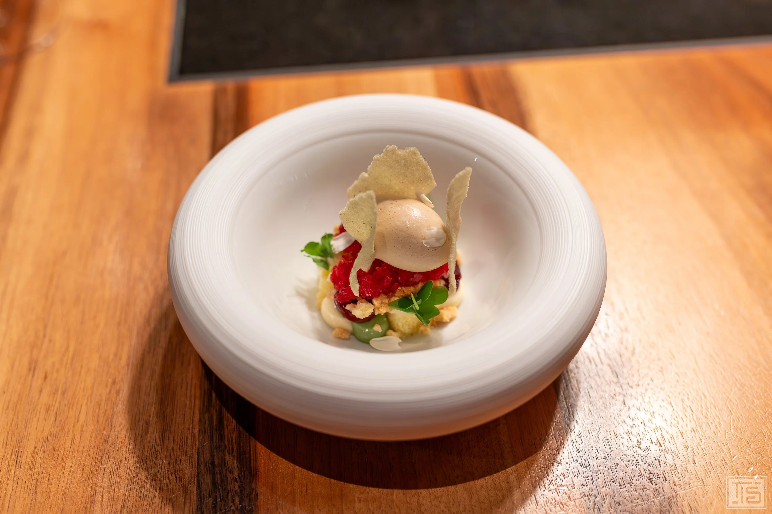 Nach den Innereien kommt nun der edle Rücken des Rehs aus aus Tiroler Jagd auf den Tisch. Kombiniert mit Cassis, Entenleber und Rande. Während die süsssäuerliche Beerenfrucht naturgemäss vortrefflich zum Wild passt und für Balance sorgt, nimmt die Rande deren Süsse auf und ergänzt sie um einen bodenständigen Unterbau. Ein Teil der Knolle kommt geräuchert zum Einsatz, was dem Gemüse eine gewisse Speckigkeit verleiht. Die passt zwar grundsätzlich sehr gut hier rein und betont die Bodenständigkeit, wird aber je nach Gabelbelegung für meinen Geschmack einen Hauch zu dominant. Wir sprechen hier von Nuancen auf der allerhöchsten Stufe, die nicht wirklich störend sind, aber in meinen Augen die absolute Perfektion verhindern.