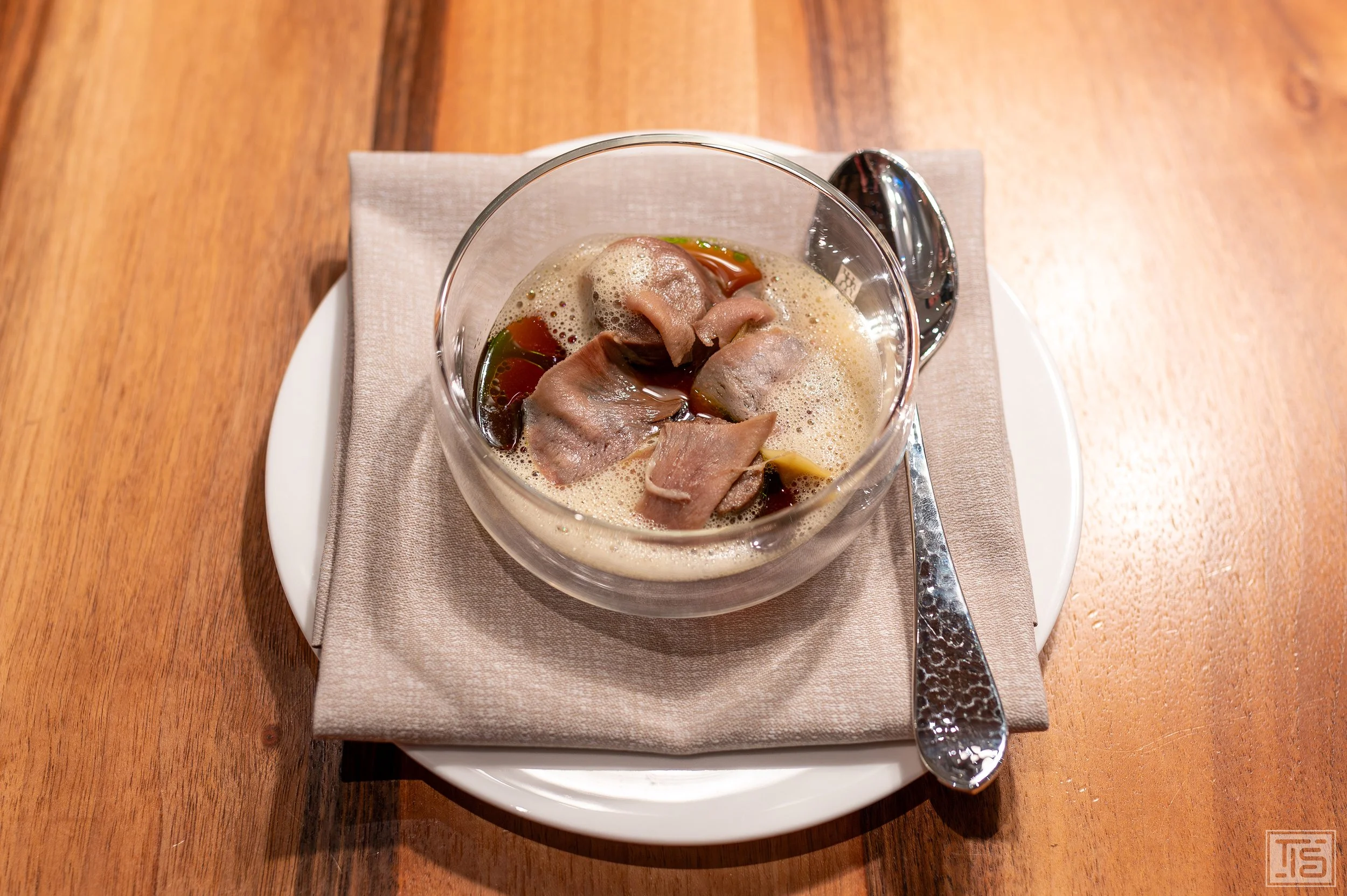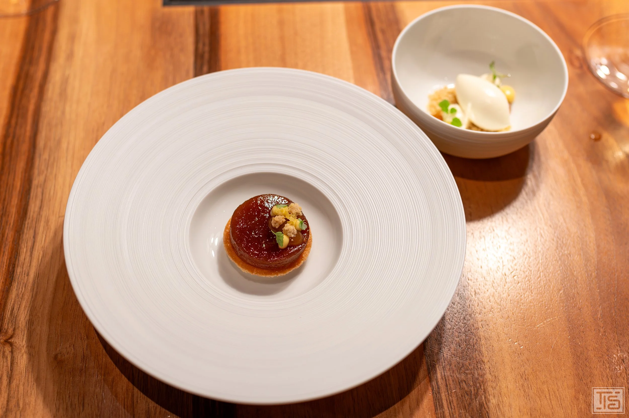 Direkt mit dem Auftakt überrascht mich die Küche mit etwas, das ich nicht mehr für möglich gehalten hätte: neue Amuse-Bouches! Gemäss meiner kurzen Fotorecherche bekomme ich gerade zum ersten Mal seit sechs Jahren nicht das Trio von der französischen Label Rouge Ente serviert. Nein, heute steht das Rind des hauseigenen Château De Raymontpierre im Fokus: Links im Körbchen liegt zwar der scheinbar altbekannte Bun, gefüllt ist er allerdings mit einem Gulasch. Obenauf liegen etwas Kraut und Zwiebeln. Rechts oben auf dem Teller ist ein Taco, die Schale hergestellt aus der frittierten Achillessehne des Rinds, gefüllt mit einem Tatar und Heilemann-typisch erfrischend thailändisch abgeschmeckt. Unten etwas eingerolltes Trockenfleisch, gefüllt mit Entenleber. Diese drei neuen Kreationen müssen sich hinter dem längst zum Klassiker avancierten Enten-Trio nicht verstecken. Der Chef setzt aber trotz den auch hier verarbeiteten Thai-Aromen mehr auf mitteleuropäische Geschmacksbilder mit Kraut, Senf und Co. Auch diese Klaviatur spielt er meisterhaft. Vor allem die gesetzten Kontrapunkte von einlullend-festlicher Üppigkeit und strammer Frische sind einfach nur grossartig.