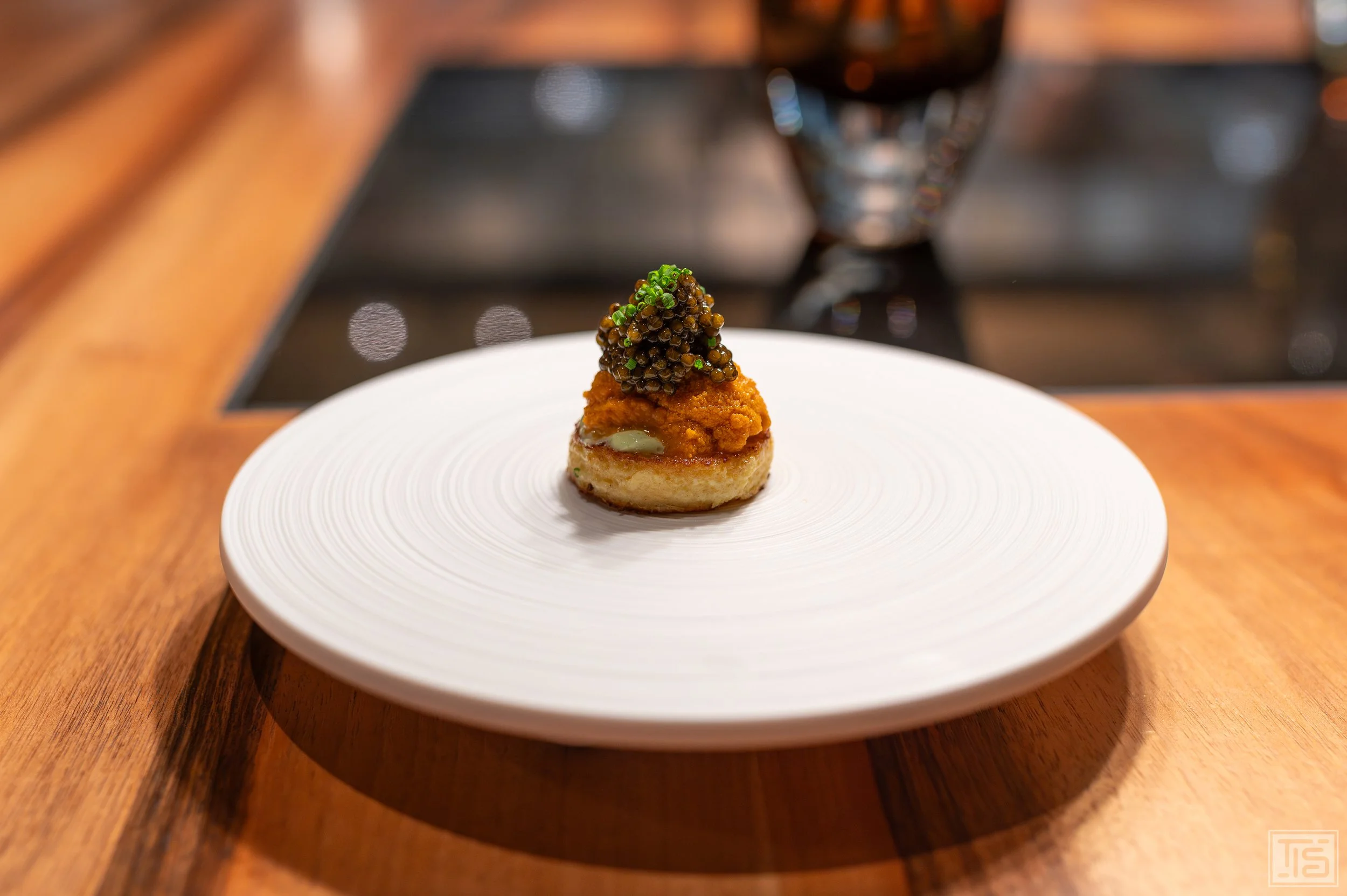 Weiter geht’s mit einer Petitesse, die es in sich hat. Auf einem rund ausgestochenen Stück French Toast liegt etwas Aioli. Darauf kommt eine grosszügige Portion kanadische Seeigel, die schliesslich mit einer Nocke Prunier Oscietra Kaviar und etwas Schnittlauch belegt ist. Ganz kurz überlege ich, ob ich von diesem doch substanziellen Happen abbeissen soll, entscheide mich dann aber, das Ganze auf einmal zu essen. Das Erlebnis ist überwältigend. Im bestmöglichen Sinn. Für einen kurzen Moment werden gefühlt alle meine Rezeptoren gleichzeitig geflutet, was mich unweigerlich die Augen schliessen lässt. Vor meinem inneren Auge zucken in Nanosekunden Bilder durch, die sich nur oberflächlich in Worte fassen lassen. Meer. Welle. Salz. Luxus. Wonne. Glück. Und doch ist dieser Happen so viel mehr als die Summe der eben geschilderten einzelnen Wahrnehmungen. So viel mehr. Wow!