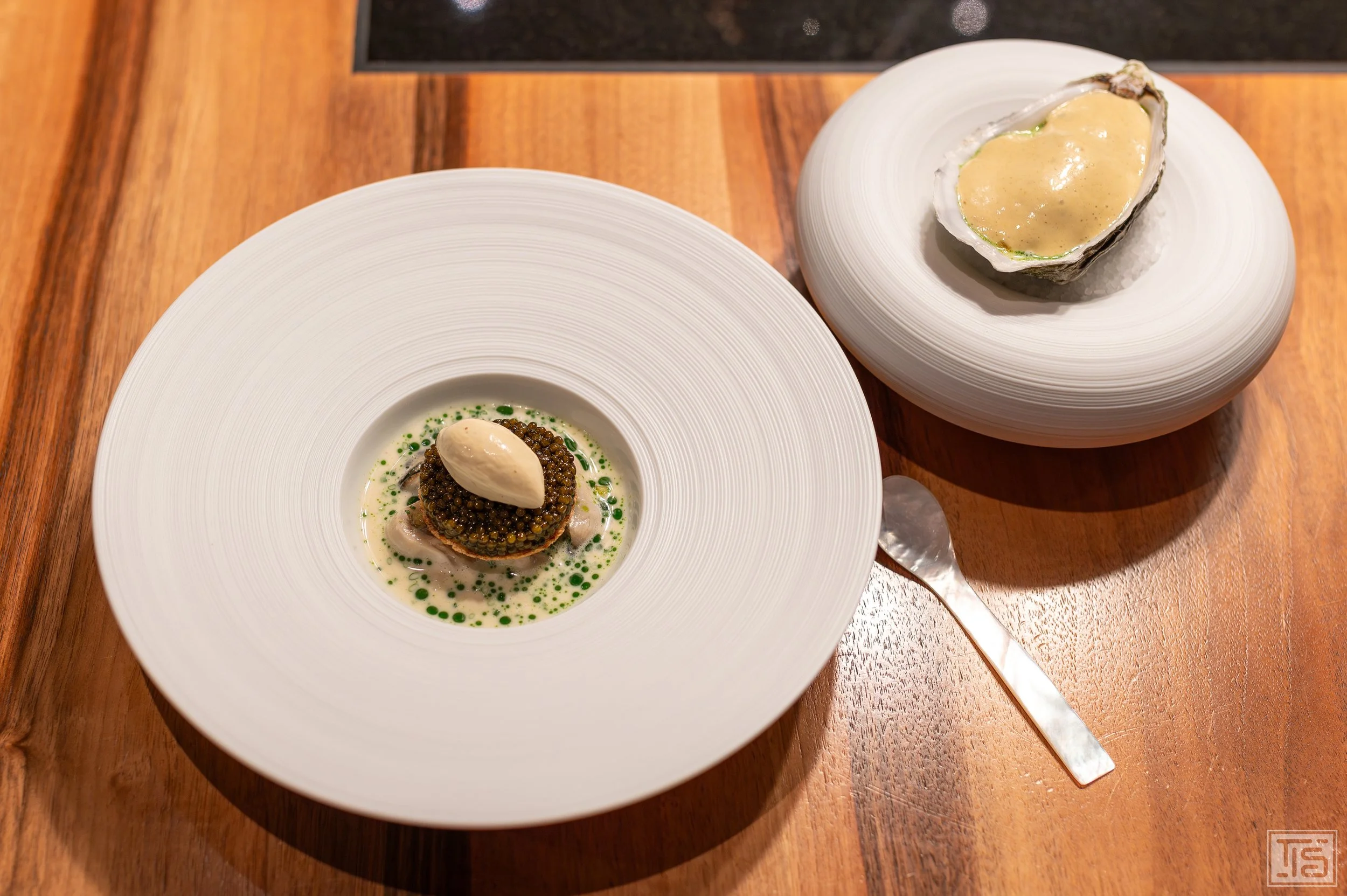Bei der Gillardeau Auster mit Sauce Béarnaise und Prunier Oscietra Kaviar präsentiert der Chef dieselben Hauptzutaten in unterschiedlichen Gewändern, einmal kalt und einmal warm. In der Austernschale befindet sich ein sanft pochiertes Stück der Molluske mit einem Hauch Kräuteröl, garniert mit Kaviar und einem luftigen Béarnaise-Schaum. Austern von Gillardeau zeichnen sich gemeinhin durch ihre Fleischigkeit aus. Diese wird durch das Pochieren und den warmen, opulenten, dabei dennoch federleichten Schaum zusätzlich akzentuiert. Ohne dabei die maritim-jodige Salinität zu überlagern. Im Teller wird ein gänzlich anderer Fokus gelegt. Man meint förmlich, die Gischt im Gesicht zu spüren. Alles wirkt sehr kühl und klar, bei aller Üppigkeit präzise wie ein Hattori-Hanzo-Schwert und unheimlich dicht. Gemeinsam ist beiden Zubereitungen, dass der Säureregler ordentlich aufgedreht ist, was immer für die richtige Balance sorgt und eine gewisse Leichtigkeit suggeriert.