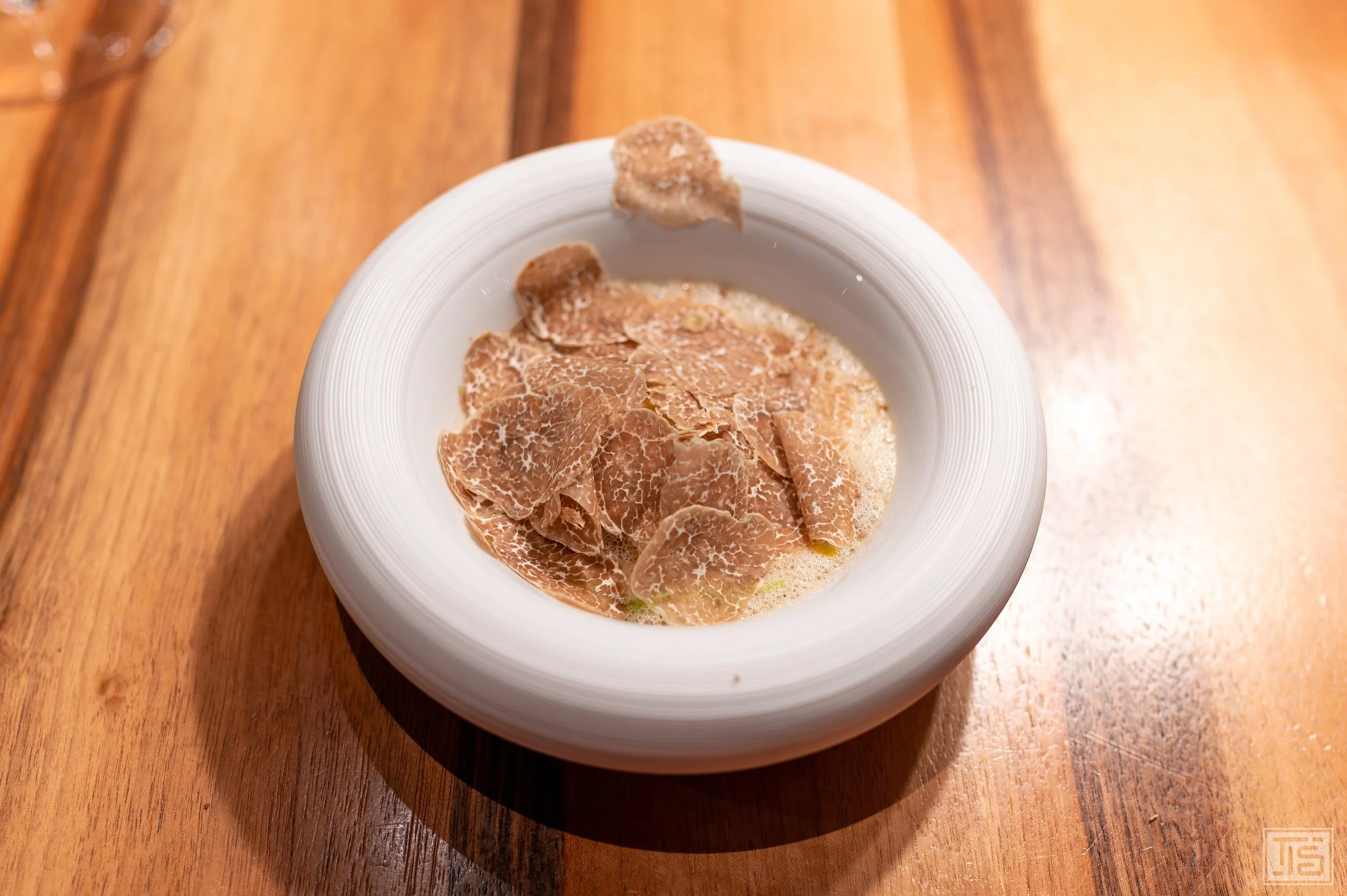 Weiter geht’s mit einem Klassiker der luxuriösen Wohlfühlküche: Eigelb vom Schlattgut Herrliberg, weisser Trüffel, Steinpilz, Nussbutter. Dass ein schlotziges Eigelb mit exzellenten weissen Trüffeln aus Alba, die beim Hobeln den ganzen Tisch mit ihrem ätherischen Aroma einnebeln, ein "Match made in Heaven" ist, muss hier nicht weiter ausgeführt werden. Wohl aber, wie man aus diesem grandiosen Duo noch mehr herauskitzeln kann. Da wäre zum einen die Nussbutter, die sowohl das Ei als auch die Trüffel akzentuiert und für zusätzliche opulente Mundfülle sorgt. Butter macht eben alles besser, wie man so schön sagt. Darüber hinaus spielen die kleinen Steinpilze eine wichtige Rolle, steigern sie doch das Umami und bringen mit ihrem leicht elastischen Biss ebenso texturelle Abwechslung ins Spiel wie ein paar Kartoffelchips. Um dem Gericht eine bodenständige Struktur zu verleihen, findet sich unter dem Trüffelregen zusätzlich etwas Kartoffelpüree. Zu guter Letzt unterstreicht fein dosierter Schnittlauch den angedeuteten rustikalen Charakter dieses Gerichts. Liest oder hört man die Zutaten, denkt man an schwere Kost. Doch es ist alles andere als das. Opulent, ja, aber dennoch ausgesprochen ausbalanciert und elegant. Auch hier ist das Feintuning perfekt. Besser kann man ein solches Gericht weder konzipieren noch umsetzen.