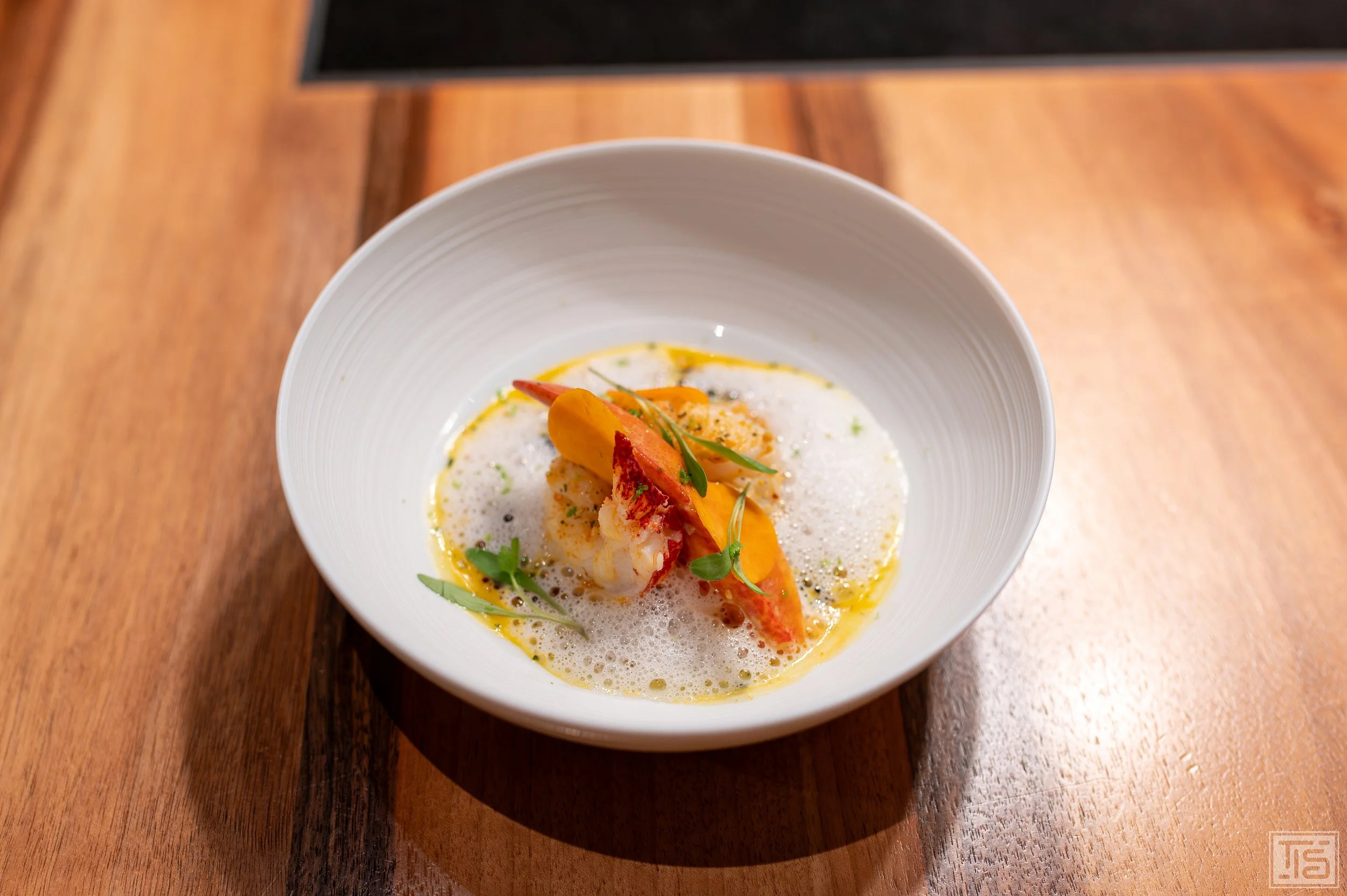 Auf nach wie vor ähnlich hohem Niveau bewegt sich der blaue Hummer aus Frankreich mit Kürbis, gelbem Thaicurry und Kaffir Limette, ist aber nicht mehr ganz so aufwühlend. Während das Thaicurry seit Jahren fester Bestandteil der hiesigen Menüs ist, habe ich es, glaube ich, bisher noch nicht mit Hummer gegessen. Selbstredend ist der Edelkrebs auf den Punkt gegart, am optimalen Schnittpunkt zwischen Saftigkeit und Biss. Auch hier ist das Drumherum noch einmal spürbar über der gewohnt enorm hohen Qualität. Die Schärfe besser eingebunden, die Süsse durch den Kürbis etwas präsenter - was dem Hummer in die Karten spielt -, die Säure und der betörende Duft der Zitrusfrüchte legen sich wie sanft vorwärtsdrängende Schleier über jeden Bissen. An diesem Teller gibt es nichts zu bemängeln. Und auch nichts zu verbessern. Ich präferiere zwar die Version mit Kaisergranat, aber das ist wirklich ausschließlich eine Frage des persönlichen Geschmacks.