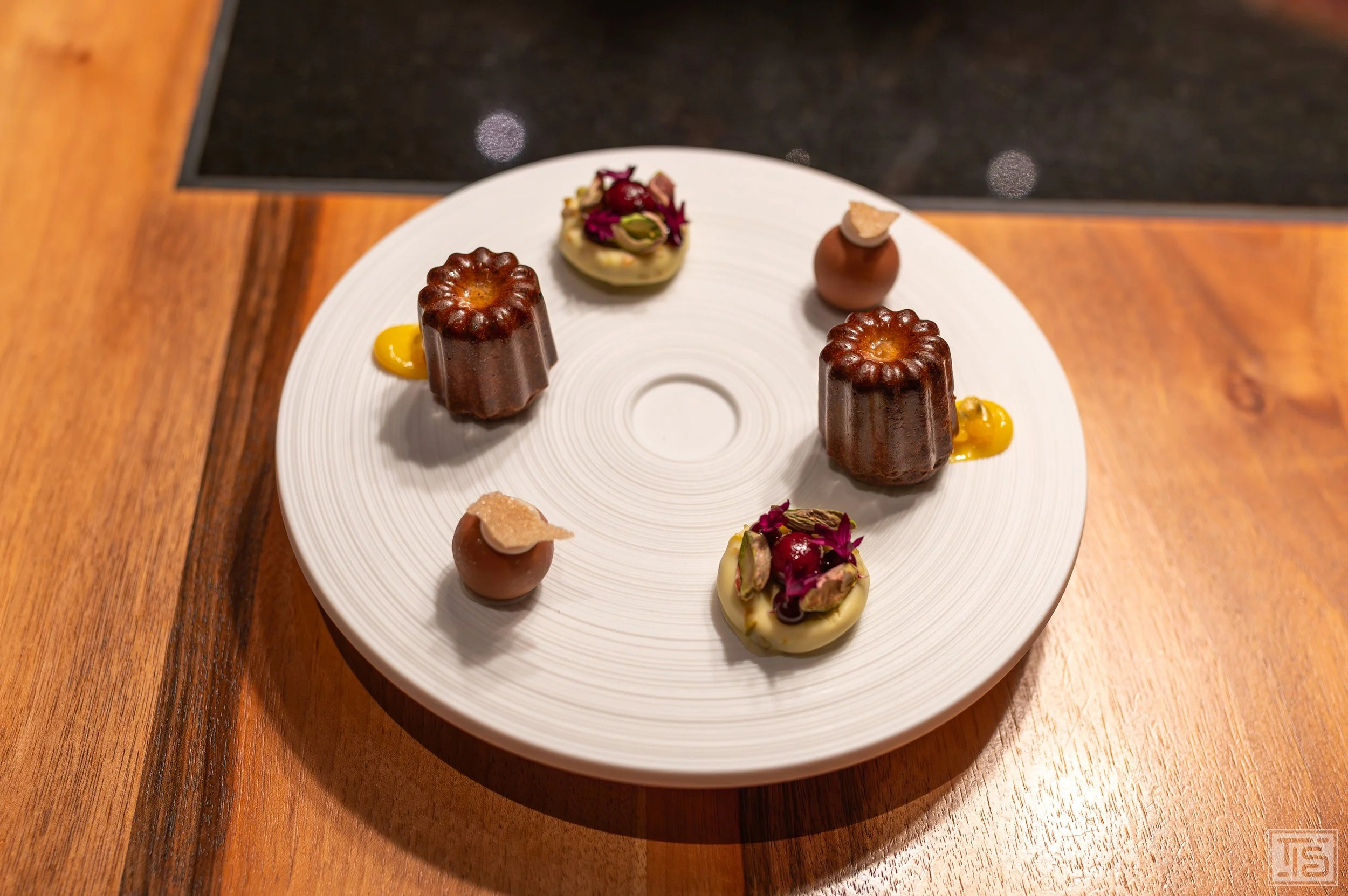 Der süsse Ausklang umfasst: Canelé, Tonkabohne, Passionsfrucht - Pistazie, Nougat, Jostabeere - "André's Bananasplit". Obwohl mich heute Abend nichts mehr überraschen sollte, wundere ich mich noch über mich selbst. Denn so gut hat mir der Bananasplit von André Siedl noch nie geschmeckt. Auch wenn diese Kleinigkeit ohnehin schon eine der weltweit an einer Hand abzählbaren Kreationen ist, bei der ich einer Banane wenigstens ein bisschen Genuss abgewinnen kann.
